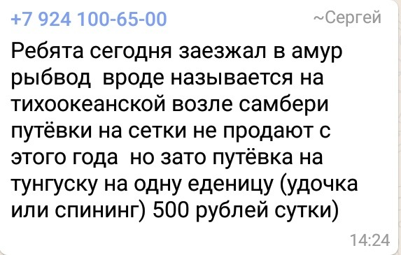 Все бы так но вот пояснение :Только что звонил на тихоокеанскую 164а ,вообщем у них по Тунгуске 2 участка с 1й по 12 створу и по 36 ю что-ли там нужна лицензия на спиннинг ,или удочку ,если всё вместе то делают какую то скидку а так да 500 р за одну снасть.Похоже на возмущенный крик души, человек даже не знает куда заезжал, большие сомнения что у него была четко сформулированная цель поездки. Надо полагать что это цена на РПУ что на Тунгуске. В чем проблема, не хочешь не бери, рыбачь в местах свободных от РПУ в разрешенные сроки.
