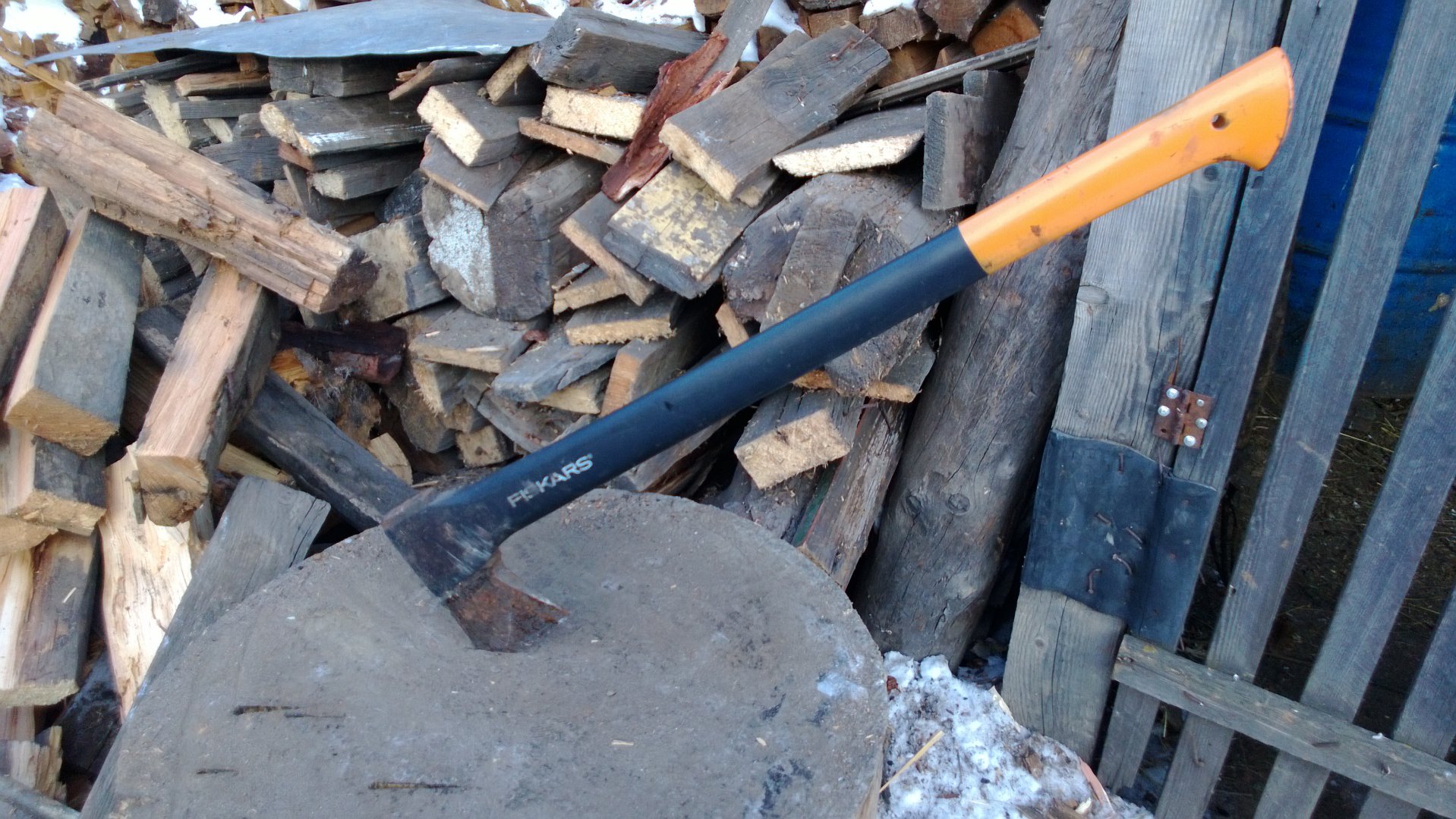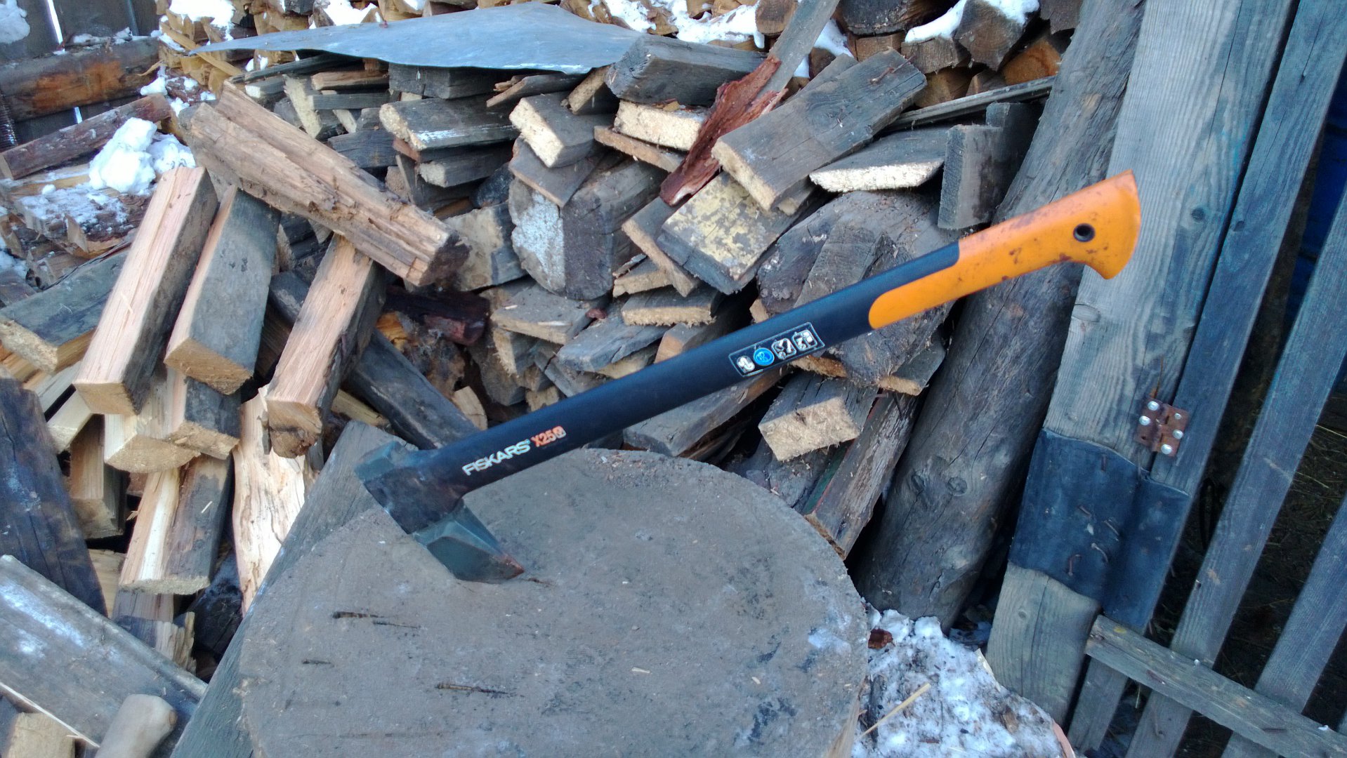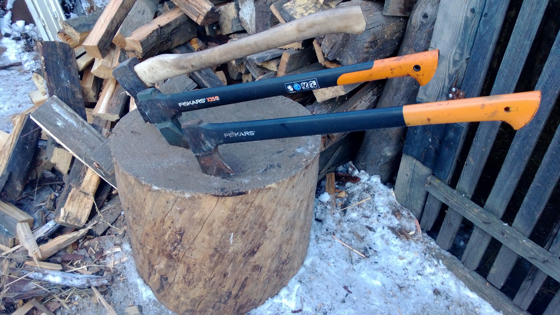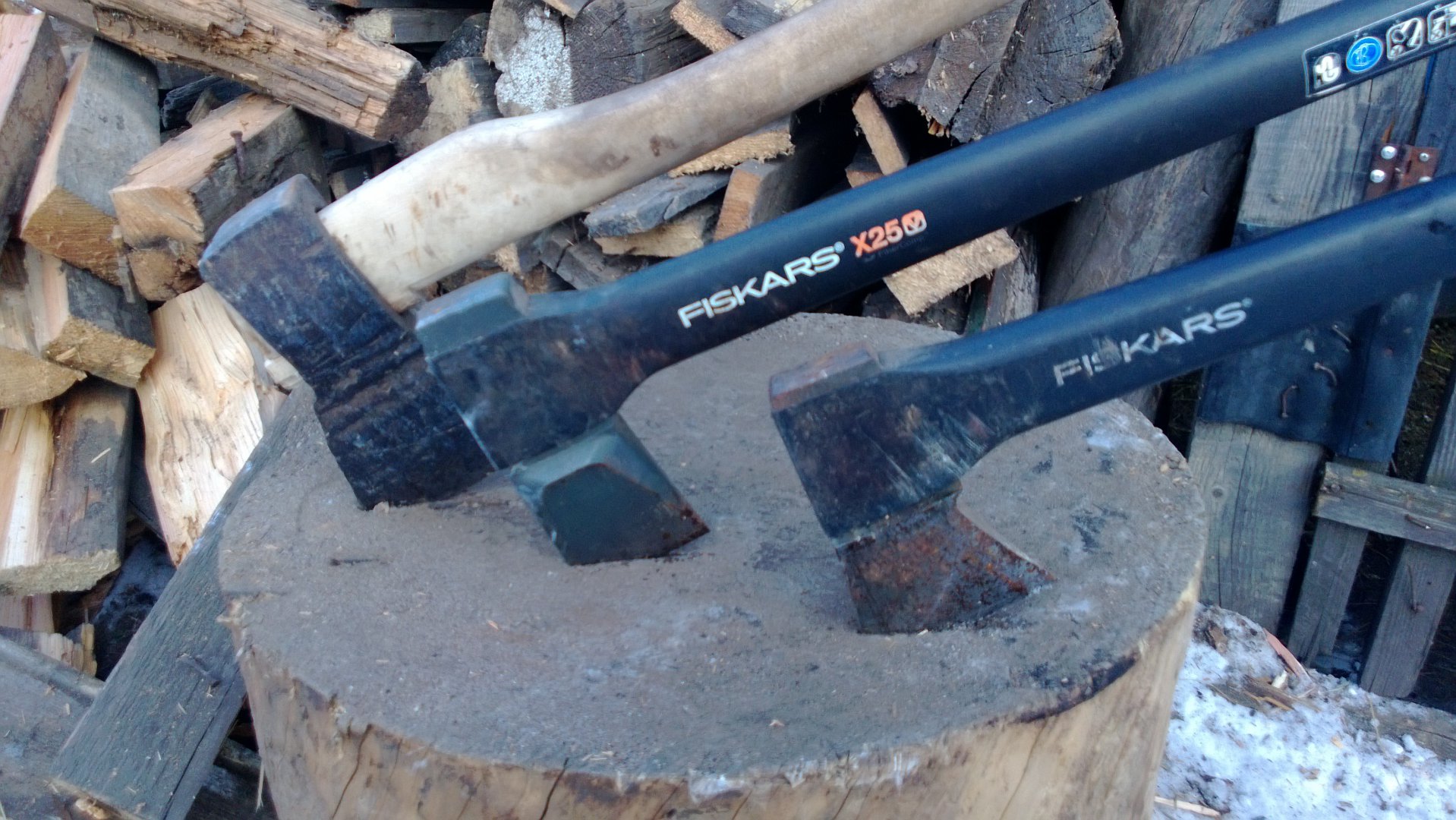 Для тяжёлых случаев есть вот такой русский колун.Весит примерно как два колуна фискарс.А для особо тяжёлых (закусило колун,застрял в чурке)есть ещё металлический клин.Ну и ещё штук пять разных советских топоров.