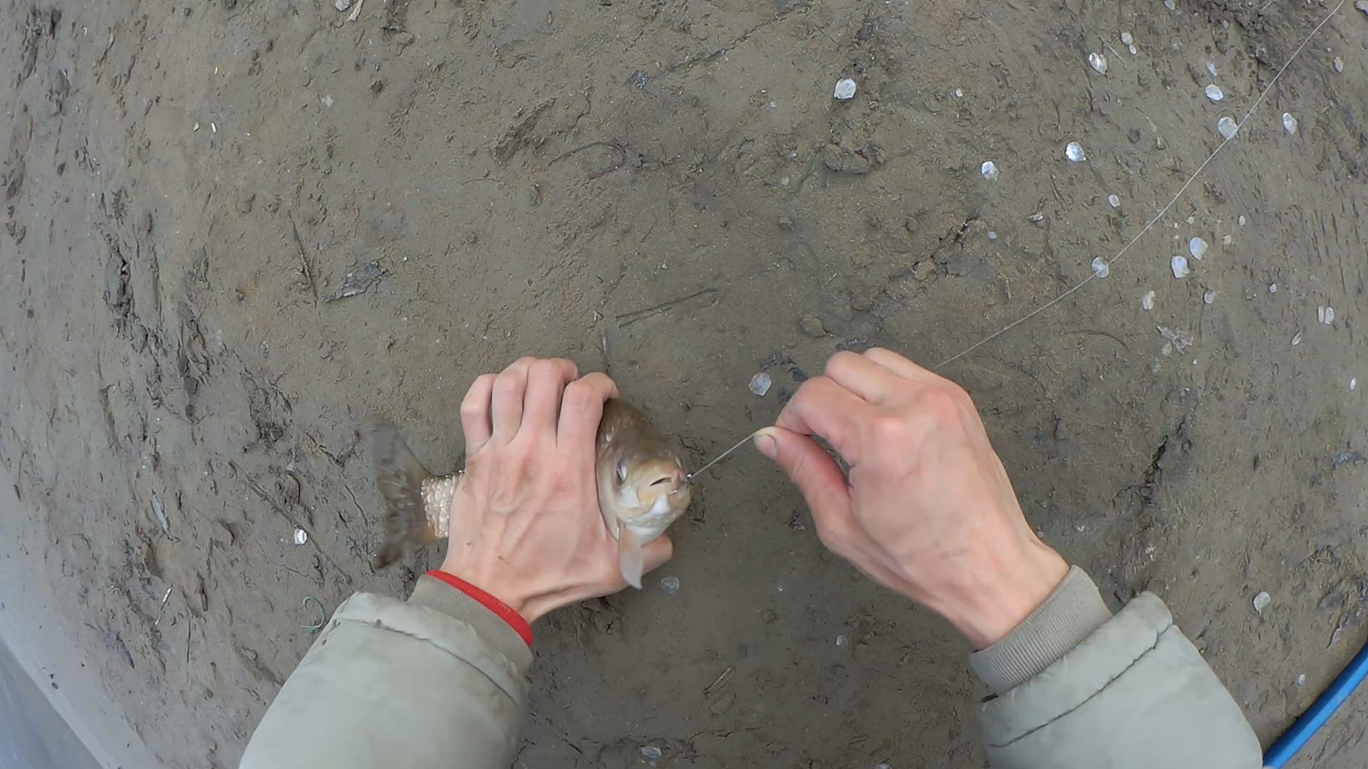Ну раз хоть как то клюет, снова перезабрасываю все оснастки. Проходит 15 минут — "паровоз". И опять снеговик из пыликов. Начинаю вываживание, не идет. Уперся в бровку. Лишь бы грузилом не запился. На том конце шнура молчок. Через минуту пошли рывки. Но по прежнему поднять не возможно. Приспускаю фрикцион и стою жду. Потихоньку сматывает. Через пару минут чувствую как груз стукнул об камни, как бы освободясь, и выйдя на песок. Еще немножко и начинаю поднимать. По ощущениям как прошлый, 4-5 кг. Но все равно прошу подстраховать соседа Толю с подсаком. Кстати, еще раз спасибо ему за грамотную помощь с подсаком. По итогу в подсаке оказался экземпляр вовсе не 4-5 кг.