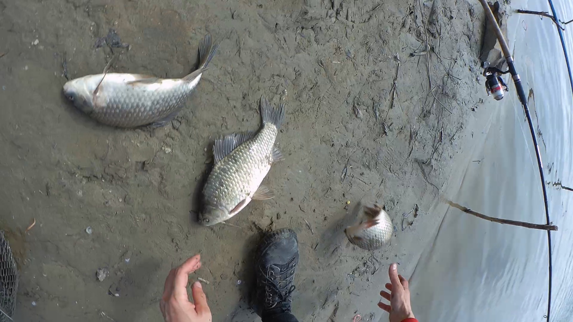 Опять перезабросы и ожидание. Около 17:00 у соседа поклевка. Интересный факт: сазан не захотел идти в подсак и сам сходу выскочил на берег :E048: