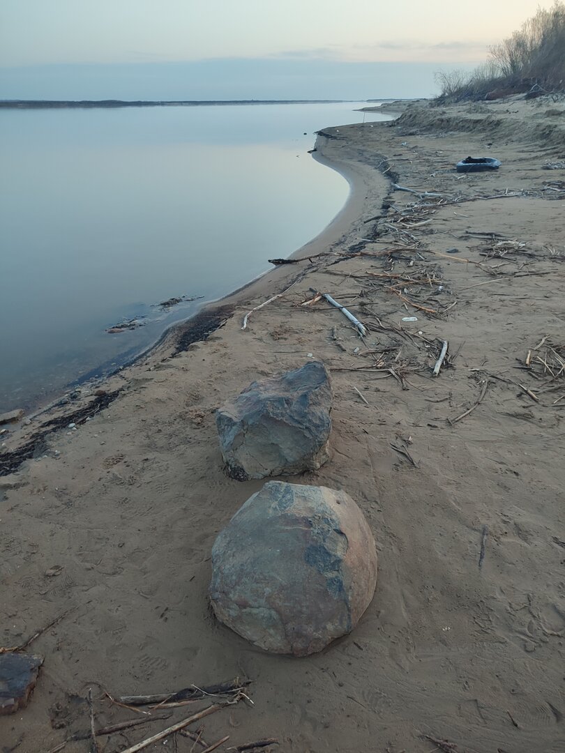 И вот 2го пол третьего мы на Вятском . Воды мало , но из-за обещанного подъёма в 25см за сутки заезжать за блоки на нашей кибитке не рискнули . Ледоходом хорошо сгребло камни на берегу , так что место для шатра пришлось поискать .