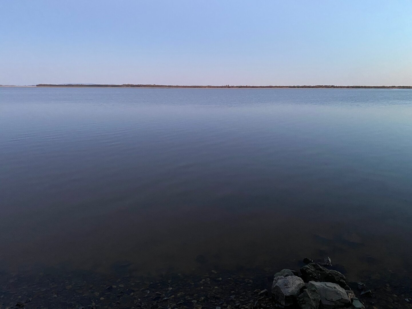 Берег абсолютно пустой. Погода замечательная.