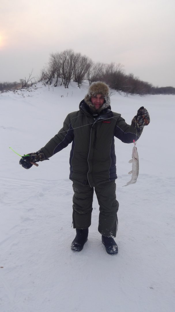 14 декабря я все таки вырвался на рыбалку на просторы р. Тунгуска, при этом предварительно полистав форум, и убедившись, что дорога в сторону домика Егеря (мне так пояснили это место) пробита решил прокатиться. Как не странно, мою идею по поводу выезда поддержал и мой тесть, который ловит рыбу в лучшем случае только с "теплой" лунки. кроме тестя мне в нагрузку еще перепал и его товарищ, клевый мужик, но рыбак такой же. Вместо запланированных 7 утра выезд состоялся около 8.30. Приехал на своротку, был приятно удивлен, что дороги нет, а одно лишь направление. Тут сразу умная речь "Вот рыбак, ты куда нас знатных людей привет?" посмотрев по сторонам, оценив возможности авто, решил проехать на эту же реку, только в стороне Волочаевки, в районе базы Тунгуска. Чудо произошло, дорога есть, рыбаки есть и все такое. Ну я сразу на лед, бурить лунку и закидывать удочку, тут тесть с вопросом " А нам?", Ну не обижать же возраст, проковырял еще пару лунок, выдав каждому по удочке, сел на свою лунку в надежде на скорую поклевку. Мои напарники по рыбалке, постояв около 10 минут на лунках, пошли а авто погреться, и когда я к ним пришел примерно через час, то убедился в том, что они уже очень нагретые и рыбалкой они уже не займуться. Через некоторое время выдав им свой неприкосновенный запас, который у меня имелся в авто в виде снаряда объемом 0,5 кг водовки, мои горе рыбак продолжали греться. Итог того дня внушительный - 2 грузных тела, не понимающих " И де Я?!" приехали домой, у меня хорек, но как пишут на форуме, воздухом надышался!