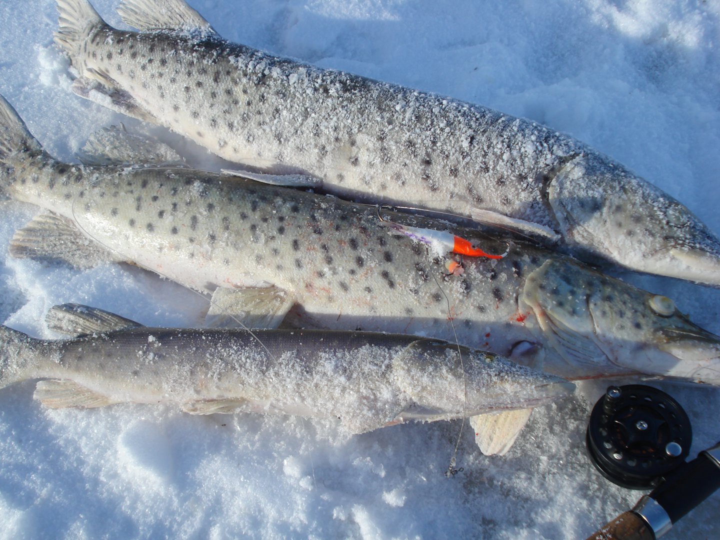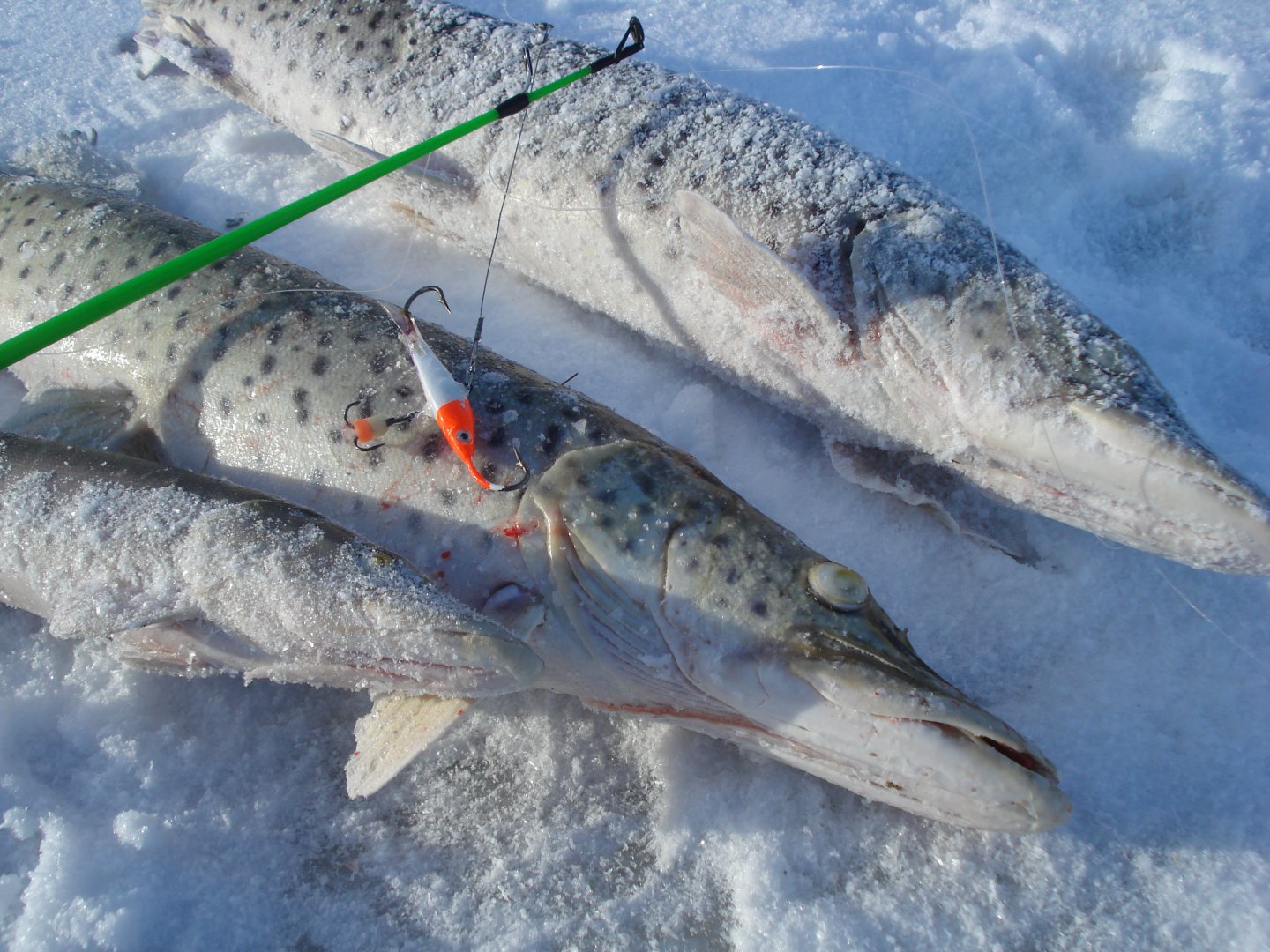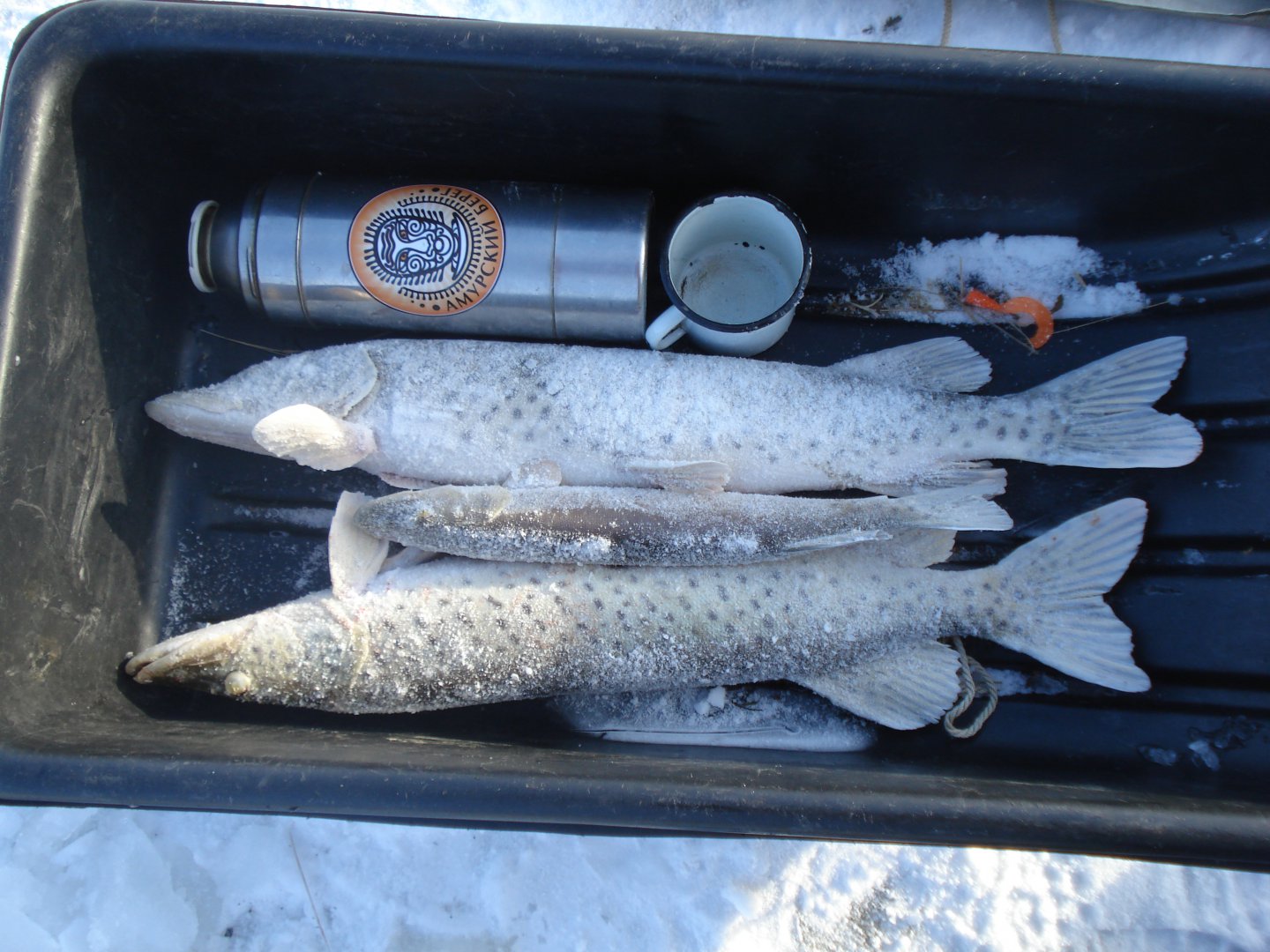 Одна поклевка настоящей щуки, три раза заводил в лунку, но щука шла немного боком и на третий раз уперлась в край лунки и сошла. Бошка в лунке видна была большая!!!