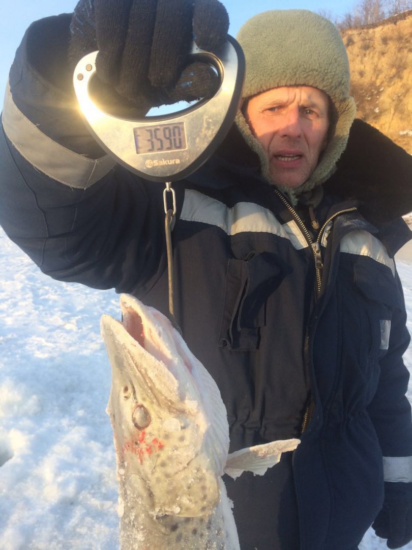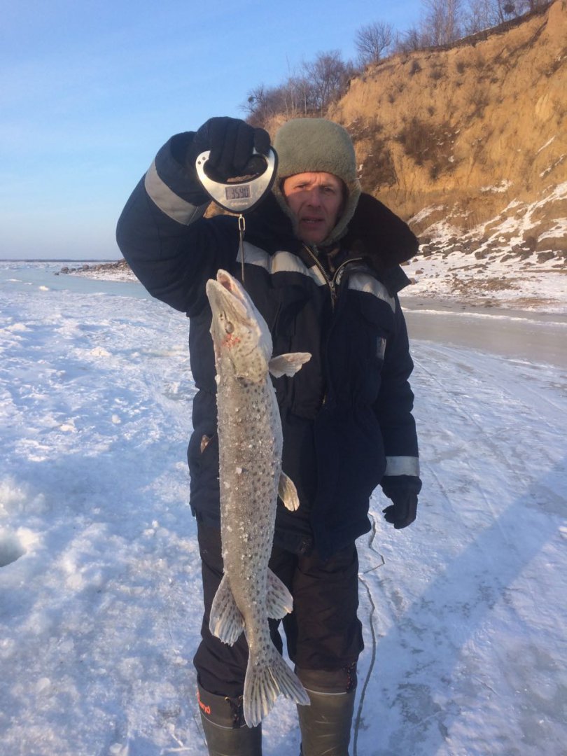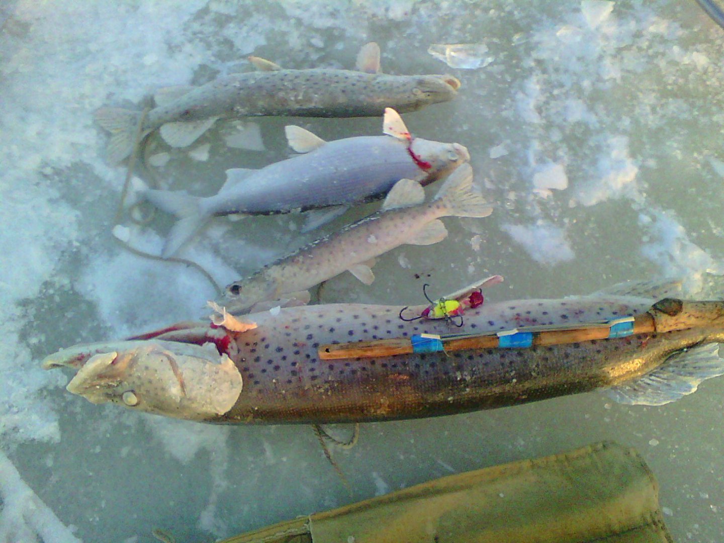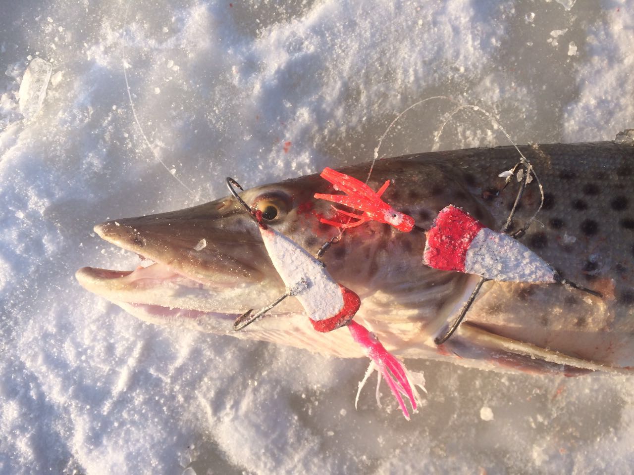 Решил он последние несколько раз махнуть на соседней лунке ниже по течению метров в 15. Пять взмахов – опять кто-то мощно придавило снасть ко дну. Подсечка, аккуратное вываживание и из лунки появляется сначала пятнистый хвост, а затем она, щука. На ней слева под глазом оба его краба, первый, изловивший таки рыбку, и другой, оторванный, с куском лески (на фото он дальше по телу).
