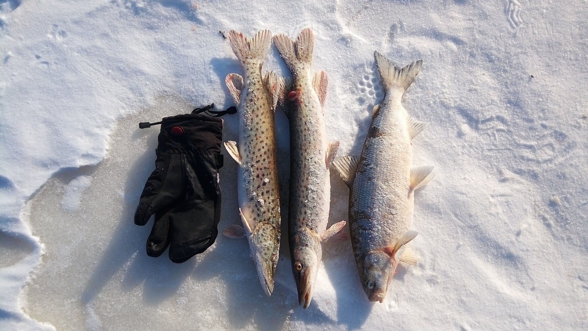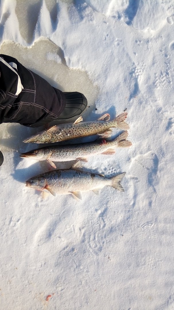 Потом затишъе,за которое успел выхлебать всё кофе и слопать чебуреки.Следующая клюнула к обеду и снова на балансир,достал ратлина из воды визуальный осмотр показал что с ним вроде всё в порядке.Через двадцать взмахов он доказал что с ним ничегошеньки не произошло щуке он по прежнему нравится.И уже часа в три когда подумывал о доме,ратлин снова выдал на гора да так что махалка чуть из руки не вылетела,дальше неописуемые события,пятёрку с ходу в лунку завести не удалось да и сама лунка за день заметно поубавилась в диаметре,но всё таки я её победил даже без багорика.