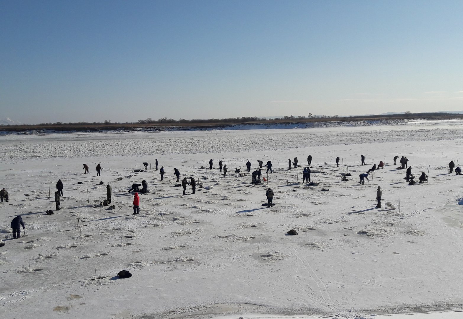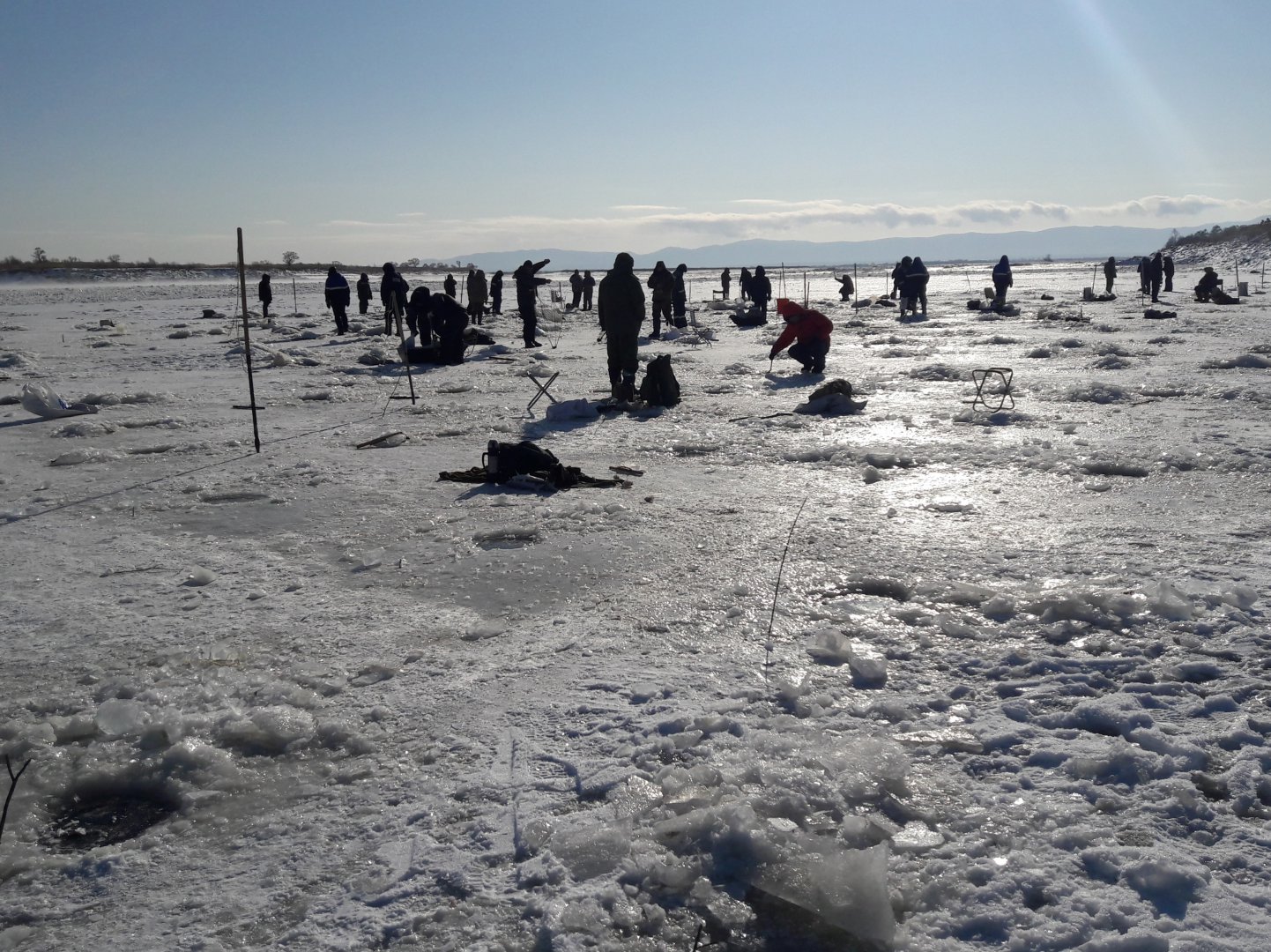 Надеясь, что в наше время необходимость передвигаться пешком даже всего на 100 метров многих останавливает, я решил прогуляться ниже по течению, оставив своё авто возле петроглифов. Сначала мои надежды оправдались: на льду к моменту моего прихода находилось всего человек 8. Но позже и сюда потянулись "голодающие".