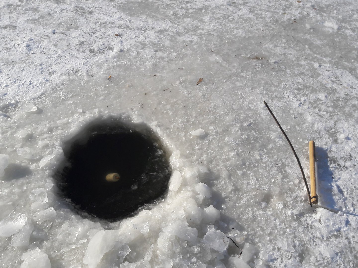 Свою первую щучку в этом сезоне я поймал довольно быстро, при пробном махании на первой же лунке. Но размер её не радовал, поэтому, после непродолжительной фотосессии, она была отпущена.