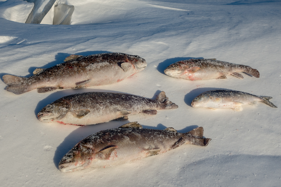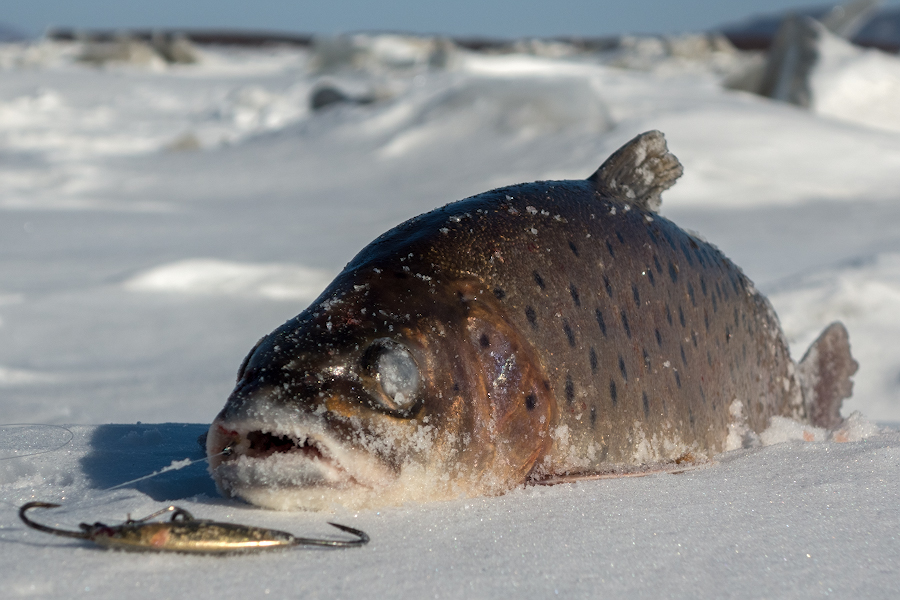 Через три часа я на месте. Опускаю сиговку в лунку, и спустя некоторое время подход и досадный сход. Черт побери! Меняю резку, и снова подход и сход. Да что ж такое?! Поклевка по ощущениям не сиговая. Неужели снова ленок?! Перевязываю крючок на поводке – ставлю большего размера. И после нескольких взмахов махалки разбойник уже на льду!