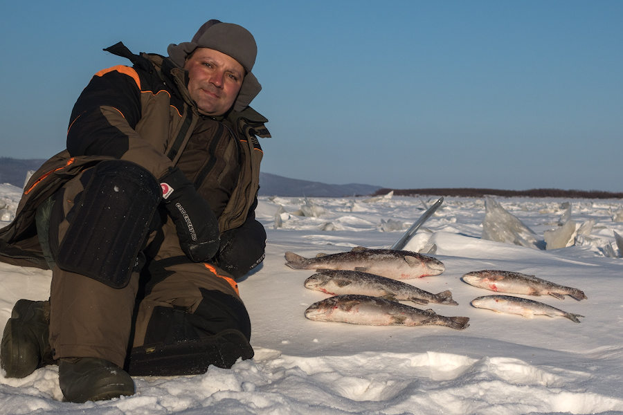 Солнце жарило так, что к вечеру морда лица обгорела: как будто побывал не на зимней рыбалке на Амуре, а в жарких тропических странах :)