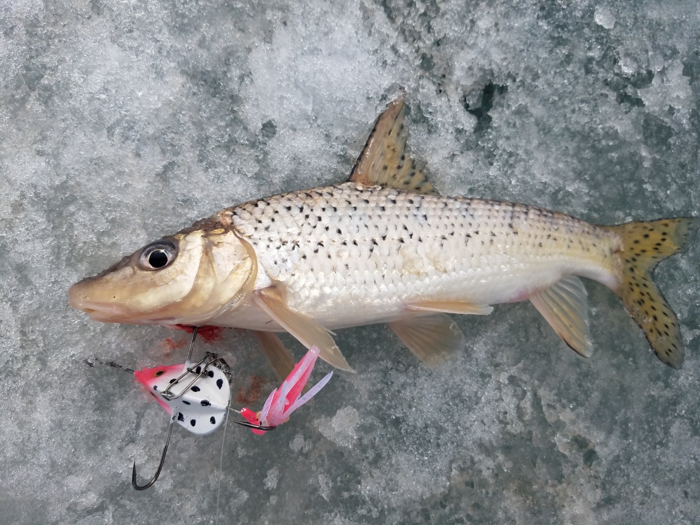 Сегодня выпало два часа свободного времени, с 13 до 15. Решил сходить на Амур, в черте города. Лунки бить~сверлить не стал, пристроился на чьей~то старой. Глубина порядка 5~6м, слабое течение. Достал махалку. Попробовал балансир, потом краба, примерно к 15 часам, перед уходом, поклёвка на краба. Тяну, что~то сопротивляется, но не очень сильно. Вытащил коня в итоге. Схватил за крючок, где был октопус.