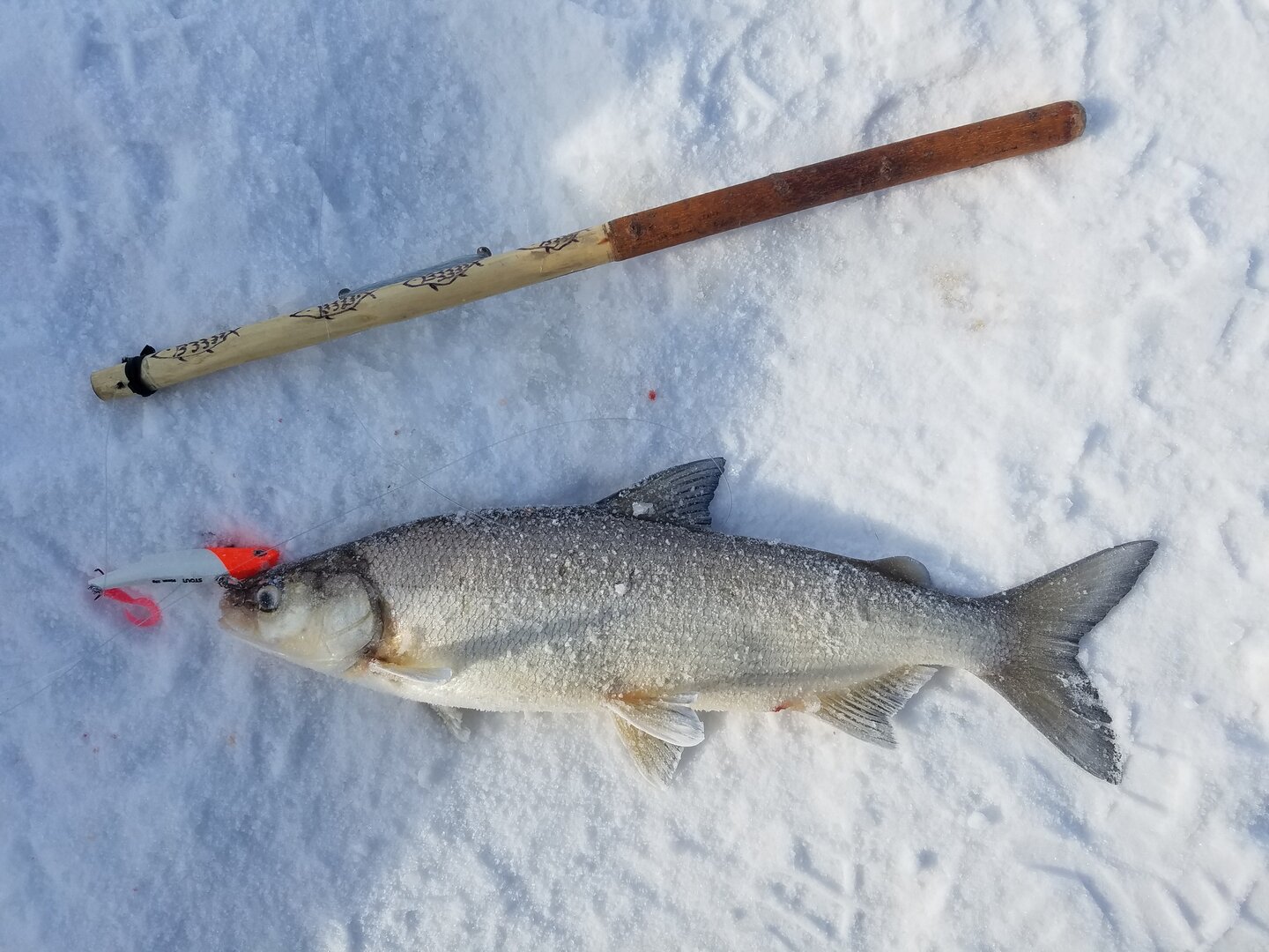 Сегодня был выезд на Амур. Давно не было таких безветренных январей и февралей(правда сегодня только 6 февраля), как в этом году. Утренний мороз к обеду отступает, на лунках становится комфортно. Пока суть да дело, махать начал в 9:00 и пробыл на лунках до 15:00. Подходы начались примерно в 10, и до 14, с равным интервалом поймал 4 шнурка. Перед сбором домой, примерно в 14:20, поклёвка и неожиданный улов в виде неплохого сига, на раттлин красноголовик. Шнурки тоже на раттлин, краб в игноре. Глубина в месте ловли примерно 3 метра.