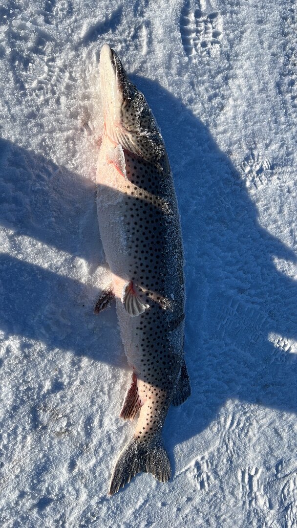 подтянул и понял,что -трофей когда увидел голову и пасть.краба просто зажала челюстями,крючки даже не просекли челюсть.начал выводить и понимаю,что она сейчас просто выплюнет краба.благо когда крутилась подо льдом и в лунке - обмотала леску вокруг головы и она ей как раз зашла под жаберные крышки,что типа аркана получилось.левой рукой держал леску,правой дотянулся до багорчика и когда его взял она выплюнула краба,благо,что петля из лески которой она обмоталась ее удержала,завел багорчик под челюсть и вот она на льду.