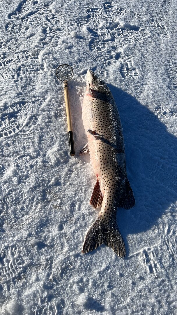 взяла на паузе -леска просто пошла в сторону.подсек и сразу понял- однозначно что то большое.рывки как у хорошего бультерьера.перехватил леску руками и начал подтягивать- в лунку сразу не получилось завести,крутилась и так глубина подо льдом маленькая была не мог ее вертикально поставить. когда завел в лунку ( понял потому как ставала вода из лунки вверх выпирать), рып чуть поспокойней стал.