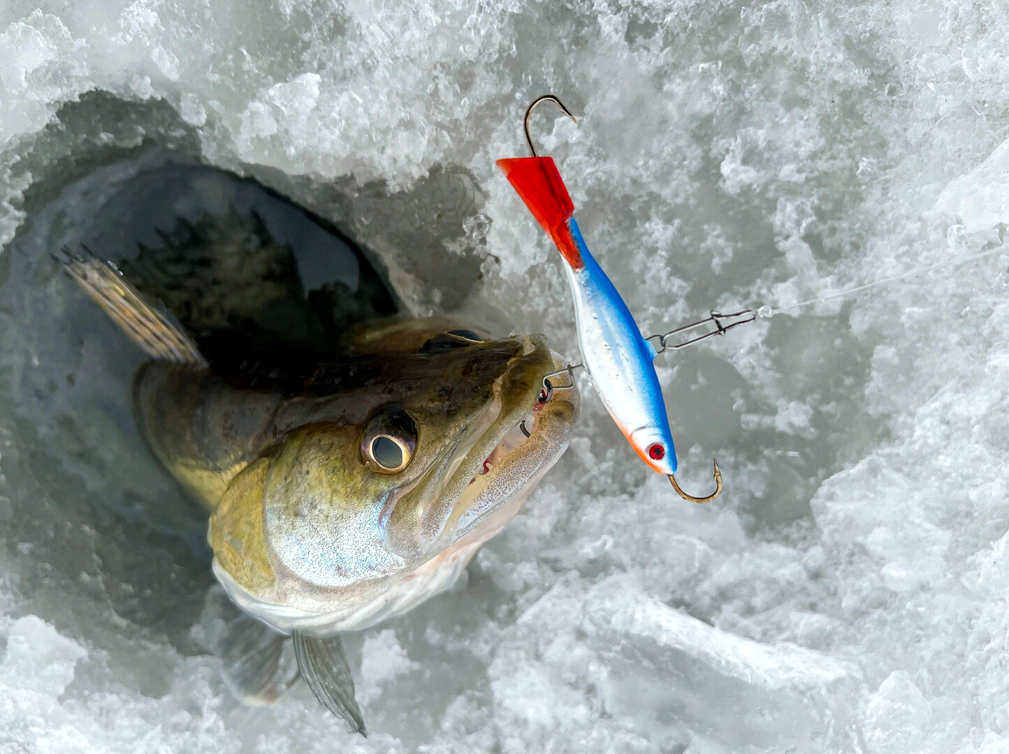Не знаю, как это получилось, но все шесть крючков раттлина почему-то оказались вне пасти этой .уки, и она, почуяв свободу, исполнила на льду "тройной тулуп" и нырнула обратно в лунку. А я, из положения "упор лёжа", помешать её побегу никак не мог.