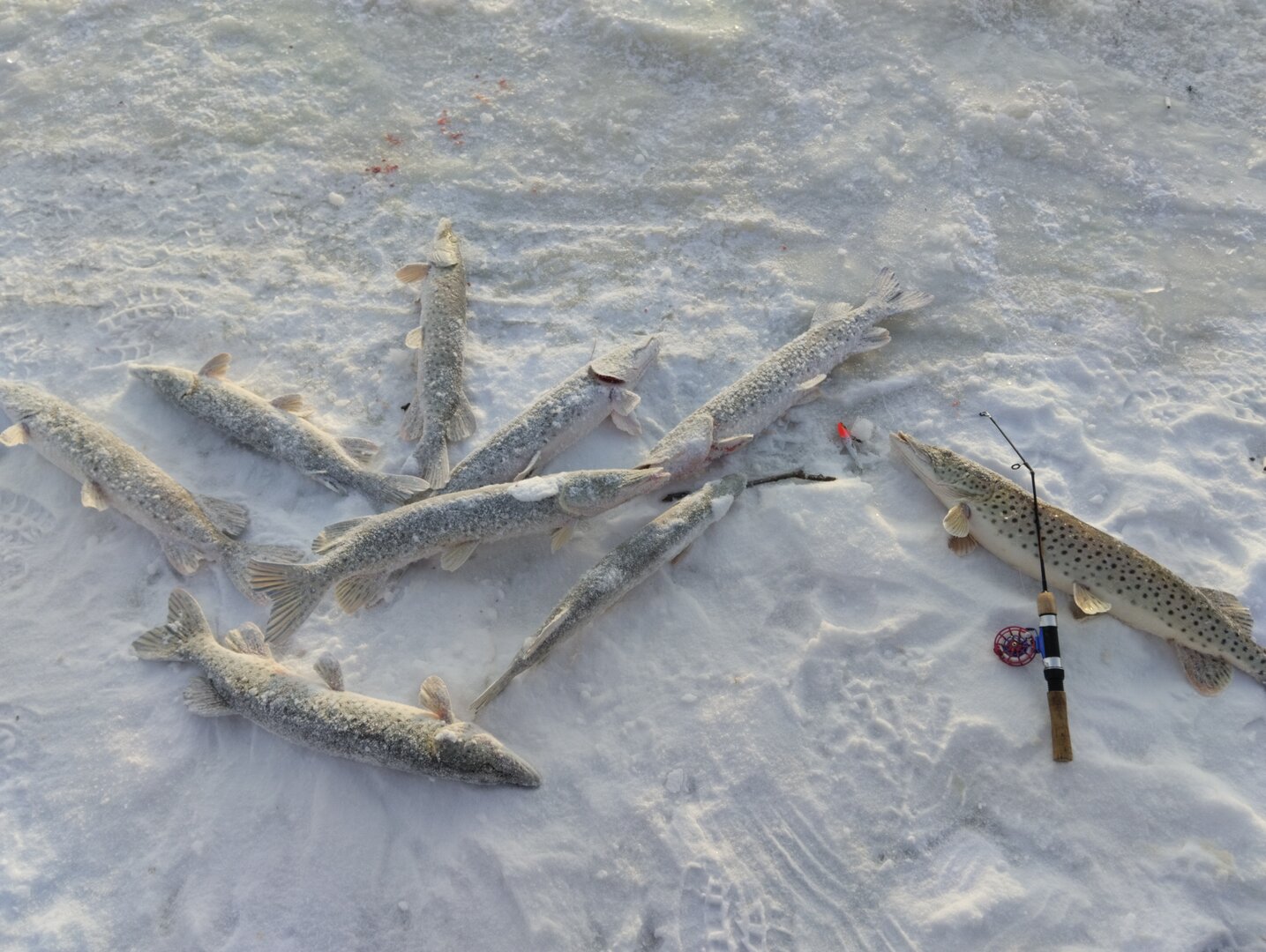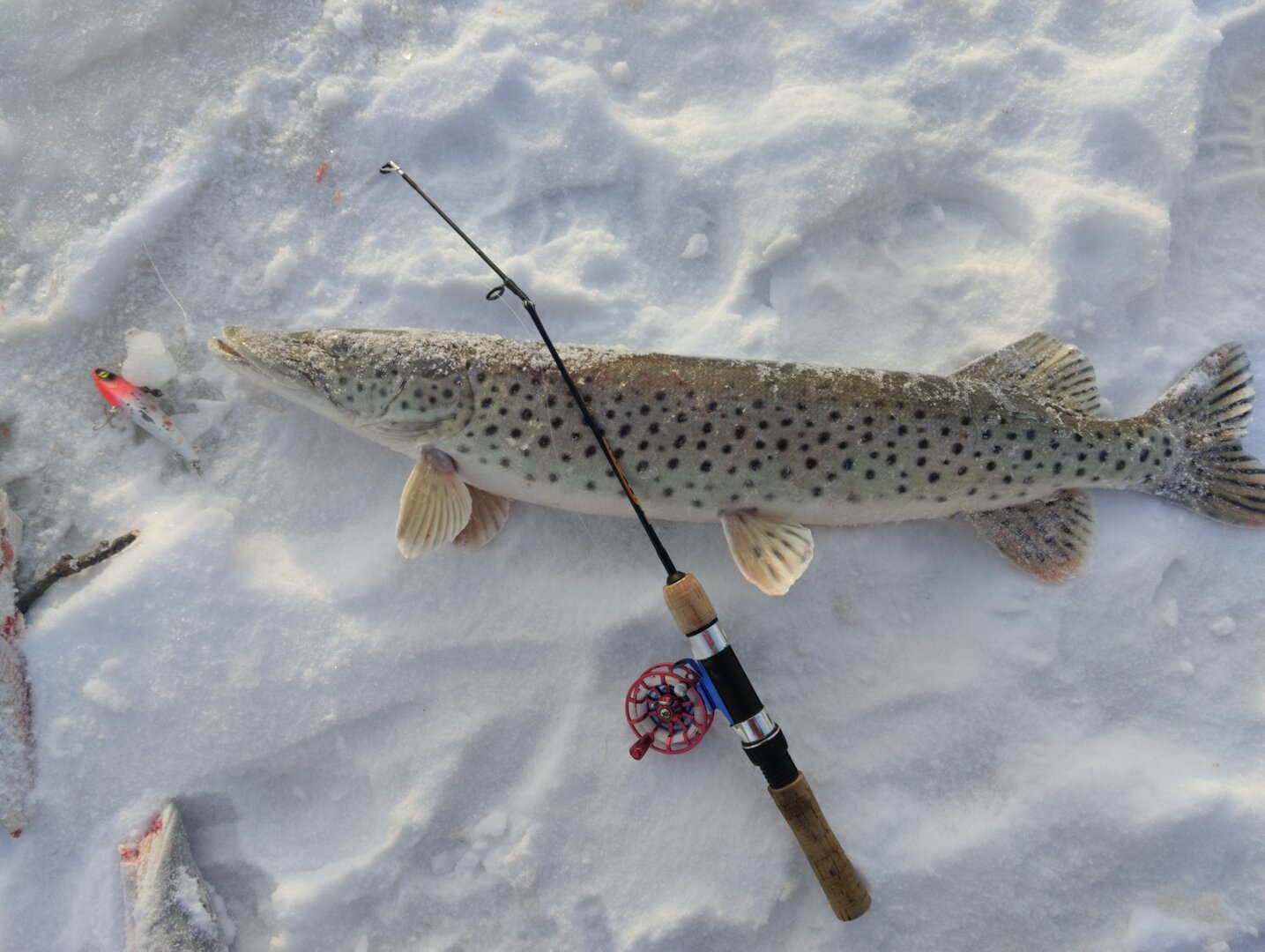Выезд сегодня - обогатившись опытом прошлой рыбалки, выехали пораньше, махать начали уже в 9. Примерно в 10:20 она пришла. Пришла только в лунку к жене. Крик из палатки: "Помогите!", дал понять, что началось. Открываю палатку и вижу как раттлин вылетает из лунки... эмоции через край, а "лошадь" ускакала дальше. В течении 10 минут, был подход не крупной щуки. Еще через минут 5, жена выволакивает на свет свою зубастую.