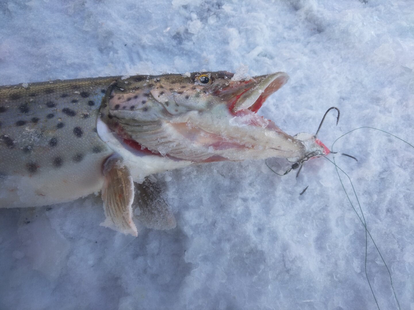 Кто где, а я на рыбалке🫣. Утром подъем в семь, водные процедуры, неплотный завтрак, прогрев машины, в 8.30 выезд, температура за бортом -29°С и в 9.30 я на лунках уже медитирую, на одной краб, на другой раттлин. Первый удар в 9.45 и околокилошница на льду, 10.10 ещё одна в районе 2кг, 10.20 опять щучка закилошница. Далее до 11.45 тишина. Пошёл пить чай и погреться малость