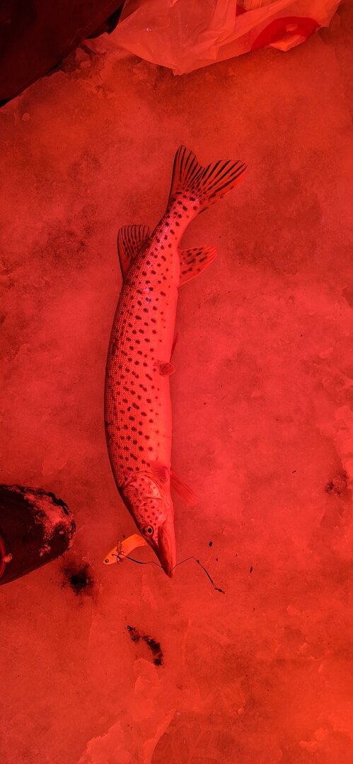 На Сикачах, не хорьканул. Ровно в 9 утра. Щука. С чётвертого раза эта самочка схватила мой краб, видимо на мой новый костюм для зимней рыбалки больше повелась))) Глубина 1.2м, течение, коса.