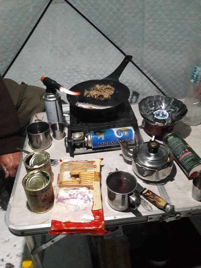 Собрались в те-же места,с ночевкой.Первый день,показал,что те мухи,на которые ловили тогда,уже не работают,пришлось подбирать.Благо на днях,было время,навязал малеха козявок,стали пробовать на них,и хариус оценил мои труды, жадно хватая муху.Но ,не все так легко,рыбу надо искать,а если и нашел,попробуй соблазнить,много ходить,много долбить,да еще до дому(табору)пилить.Просто сравнение,к нам с обеда присоединились трое товарищей,за день поймали по рыбке,дюже расстроились и со словами,что рыбы здесь нет и больше сюда не поедут,после ночевки уехали за щукой.Да это не Эльдорадо,никто не обещал,что приехав,сел на одну лунку, будешь таскать одну за одной.Мы ближе к вечеру,опять поставили девять подпусков, все-таки хотелось поймать ленка,а он там знаю есть,и пошли до машины.