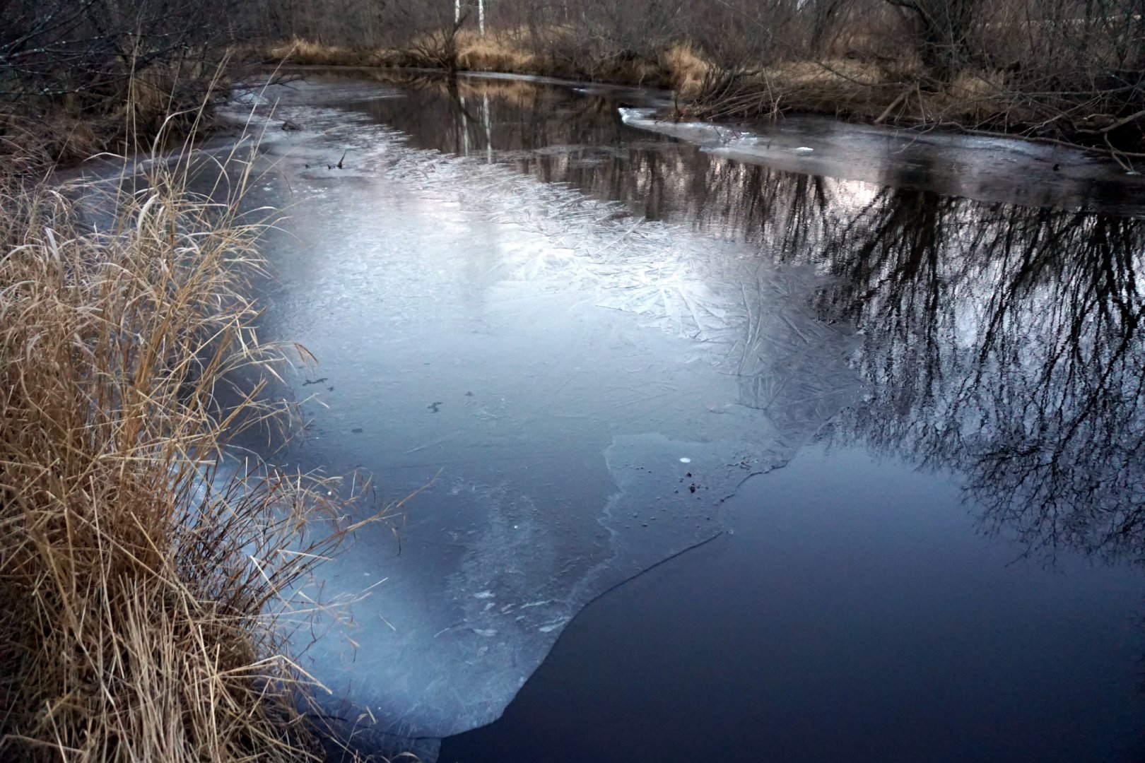 Утром приморозило основательно, -8.Речка встретила несколько неожиданно, вся в заберегах.