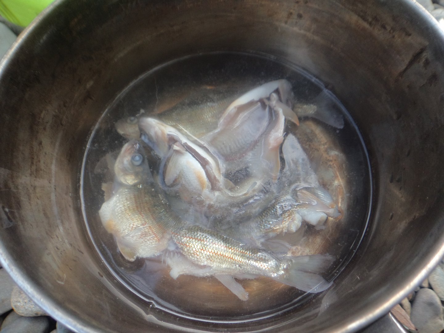 У меня не было овощей с собой, но всегда в рюкзаке имеются приправы и соль. Хариус был хоть и небольшой, но для ушицы пойдет. Я почистил рыбу, положил ее в кипящую воду, посолил, положил лаврущки, перчику и через пять минут уже наслаждался ароматной таежной ухой их хариуса.