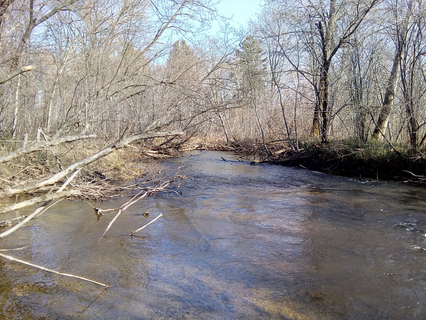 В четверг съездил на свою речку. Помахал спиннингом, пробежался вдоль берега туда-сюда....Ни одной поклевки...Погода прекрасная для октября - солнечная, тихая. Лист облетел, не плывет по речке...Но рыба категорически отказывалась пробовать на вкус блесна....Думаю, все из-за низкого атмосферного давления в этот день...Хотя может и не в нем дело...Но все же день прошел не зря,положительных эмоций набрался, по тайге прогулялся, осенним воздухом надышался, кету в речке по спинке погладил, почтил минутой молчания ушедшего к праотцам Хозяина тайги да поехал домой.....