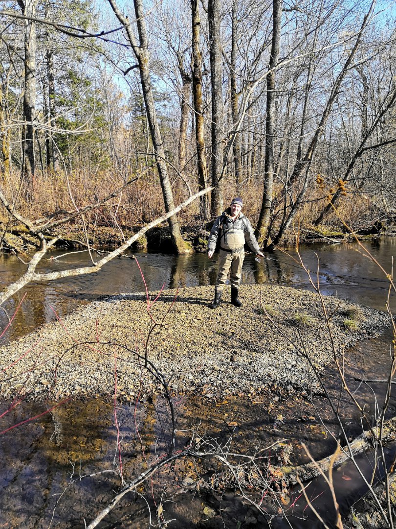 Начинаем задумываться, что пора бы уже и выходить, ещё идти хрен знает сколько. Впереди виднеется ямка, на которой решаем закончить рыбалку. Я задержался сзади, а товарищ уже делает первый заброс.