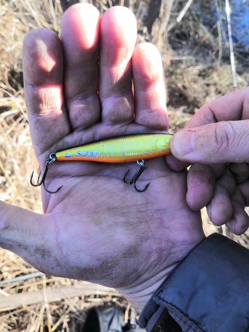 Помолившись столь причудливым образом, начинаем вытаскивать воблер, а влетел он сильно. На вываживании всё-таки разогнул один тройник. Воблер погрызен, как будто его ела сотня щук.