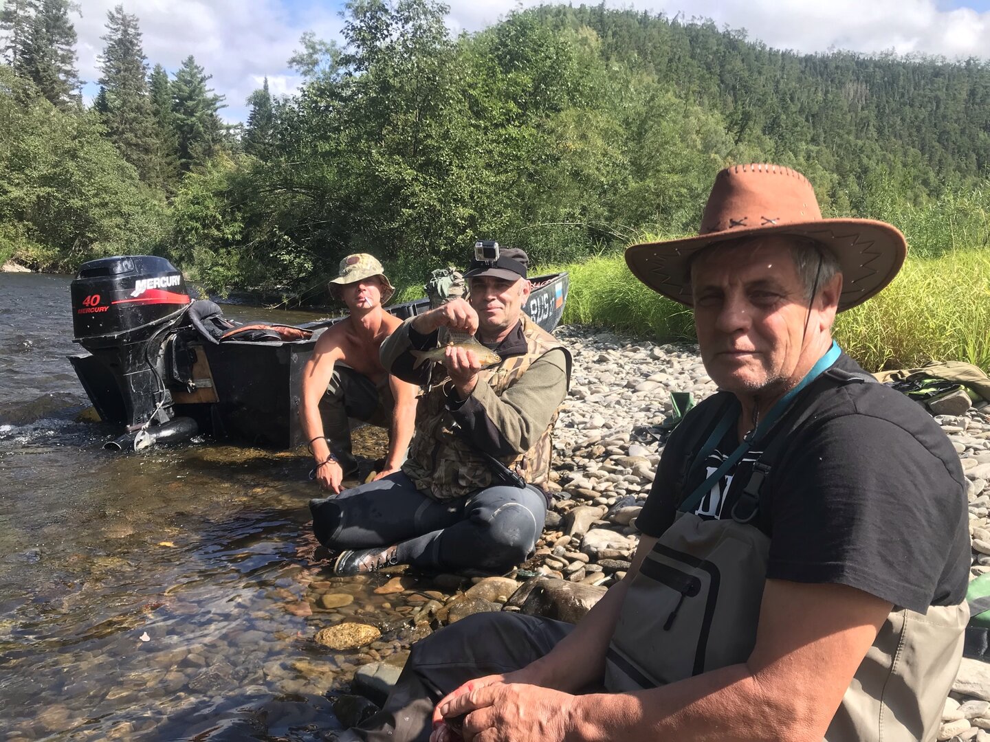 Добравшись до первого перспективного места, собираем спиннинги и отправляем наши приманки в реку. Первому удача улыбнулась Александру. На его приманку польстился неплохой ленок.