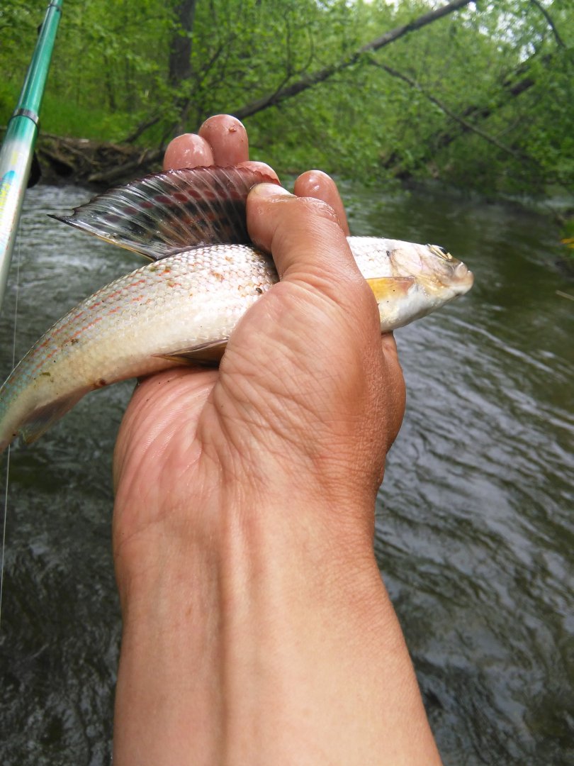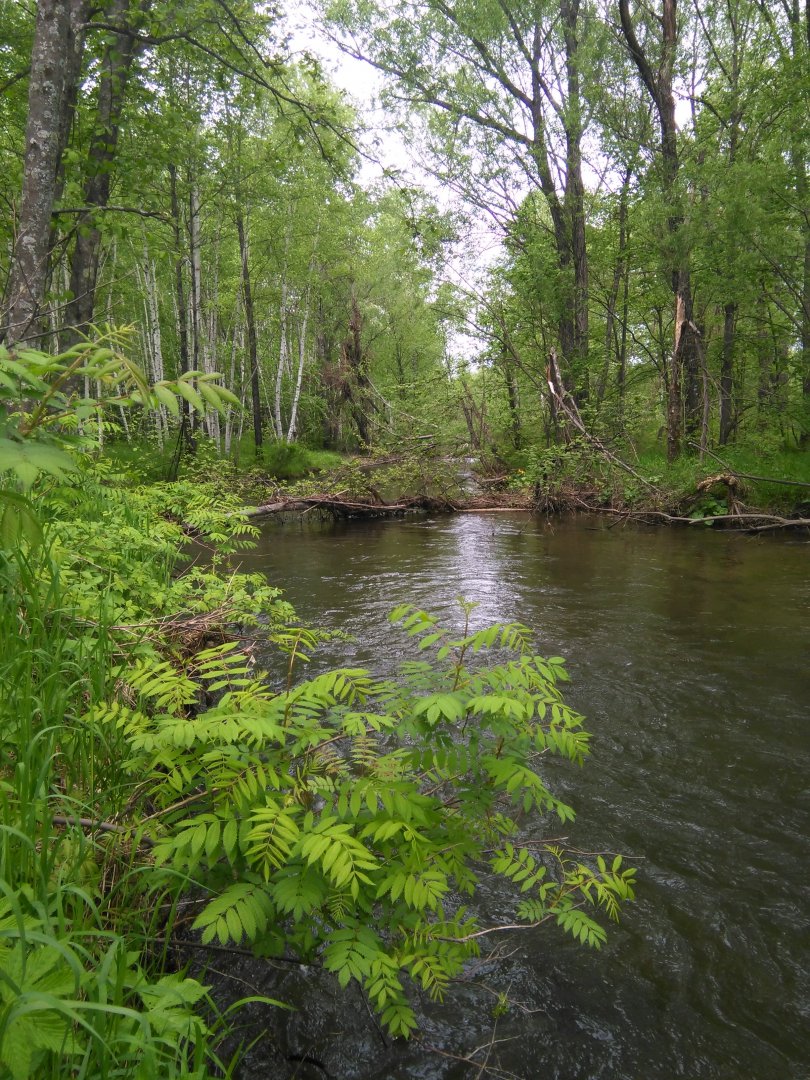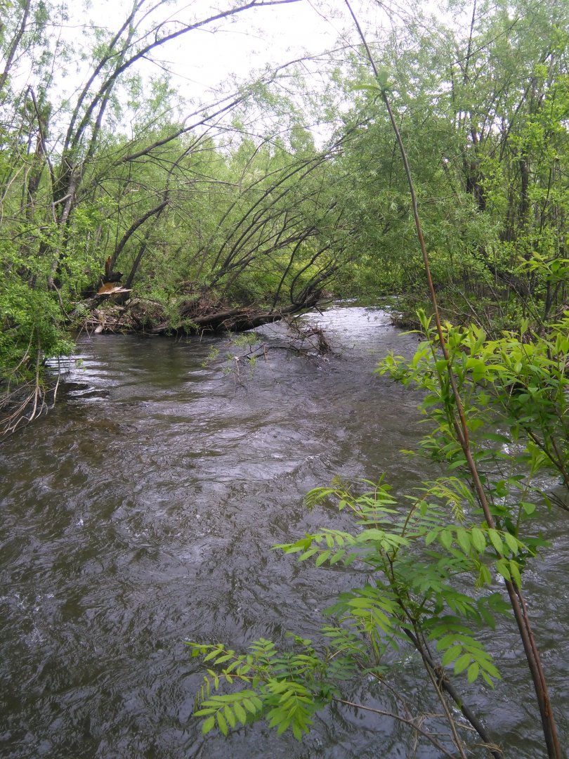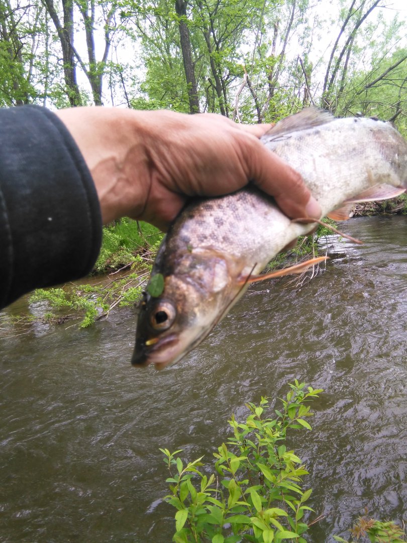 Знакомый ручеёк. Может быть и не он и я ошибаюсь, но когда ездил строить "базуху" в Высокогорный, проезжая мост через р. Гур, заскакивали не на долго за обдирчиком!!! После многочасовой трясучки на грузовике, было кайфом освежиться на небольшой по продолжительности остановке!!!Снова работа закинула меня на пару дней в район Снежного,ну и пару часов удалось урвать на рыбалку.В Гуре воды дохрена ловить даже пробовать не стал,поехал на ручей в котором рыбачил осенью.Снежная зима и на ручье умудрилась наломать дров,многие деревца положило стволамми в ручей и в некоторых местах стало просто не возможно по нему ходить.Водички конечно как и везде было многовато,но рыбка ловилась,на жарёху взял пять леночков и пять харюзков,всё остальное мелкое было возвращено ручью.Работала марковка,хариус активно питался с поверхности над которой тучами вились комары,но нахлыста и сухарей у меня просто нет.Удивило что не попалось ни одного чебака и гольяна.