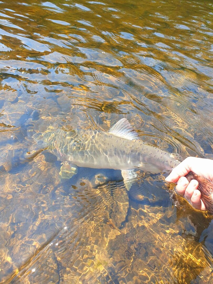 Встав на небольшом острове, я сделал несколько забросов проверочной блесной, это Блю Фокс 3 размера, которая всегда провоцирует кого-нибудь на резвую поклевку, что произошло и в этот раз, бросая к противоположному берегу и делая небыструю проводку, я ощутил резкую поклевку и бодрое сопротивление. Виновником данных действий оказался детеныш тайменчика, который после получения нотаций был отпущен домой.