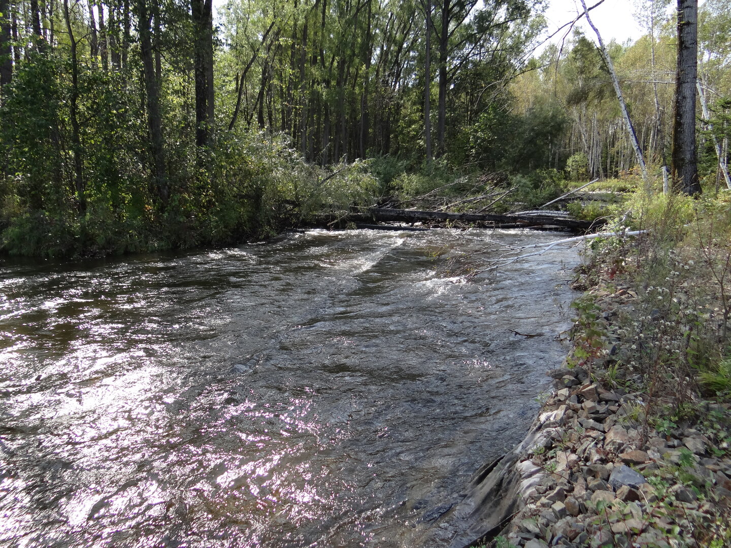 В воскресенье 25 сентября, после прошедших дождей решил прокатиться на мопеде до ближайшей горной речки. Обалденный осенний лес, умытый последним дождем стоял весь в золоте, неописуемой красоты, а воздух, который врывался в мои легкие, был вкусным, прохладным и насыщен всевозможными осенними запахами, это было просто сказочно. Я конечно, попробовал, несмотря на большую и слегка мутную воду, ловить хариуса, но поймав несколько небольших рыбин, понял, что это в данный день неперспективное занятие, поэтому сварил чаю, попил его и поехал дальше бороздить по лесным дорогам. Получив огромное удовольствие, возвратился домой.