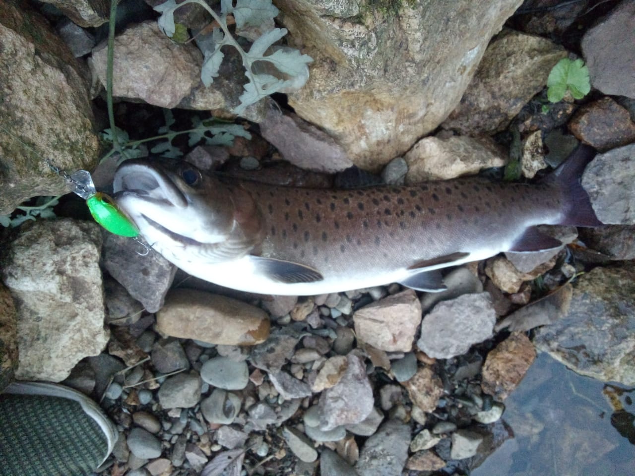Вырвались посмотреть на рыбу, недалеко за город, почти на равнине. На горных речках воды прилично. Ленок преимущественно такой как у меня в руках и меньше. Брал на джиг и вертушку, воблер в основном игнорировал. Почти весь отправился расти дальше. Хариус присутствует, но количество желает лучщего. Это наверно гонцы. Тем не менее, рыба есть, ловится и есть надежда что дальше будет лучще.