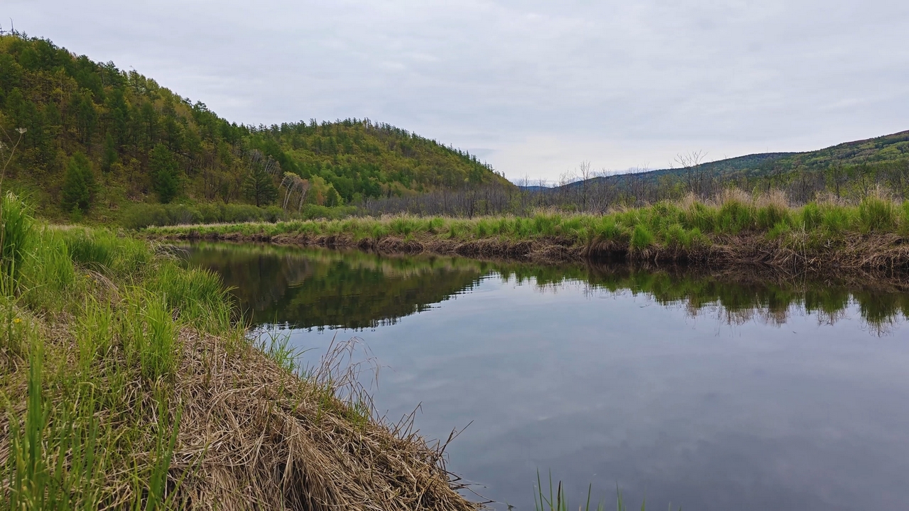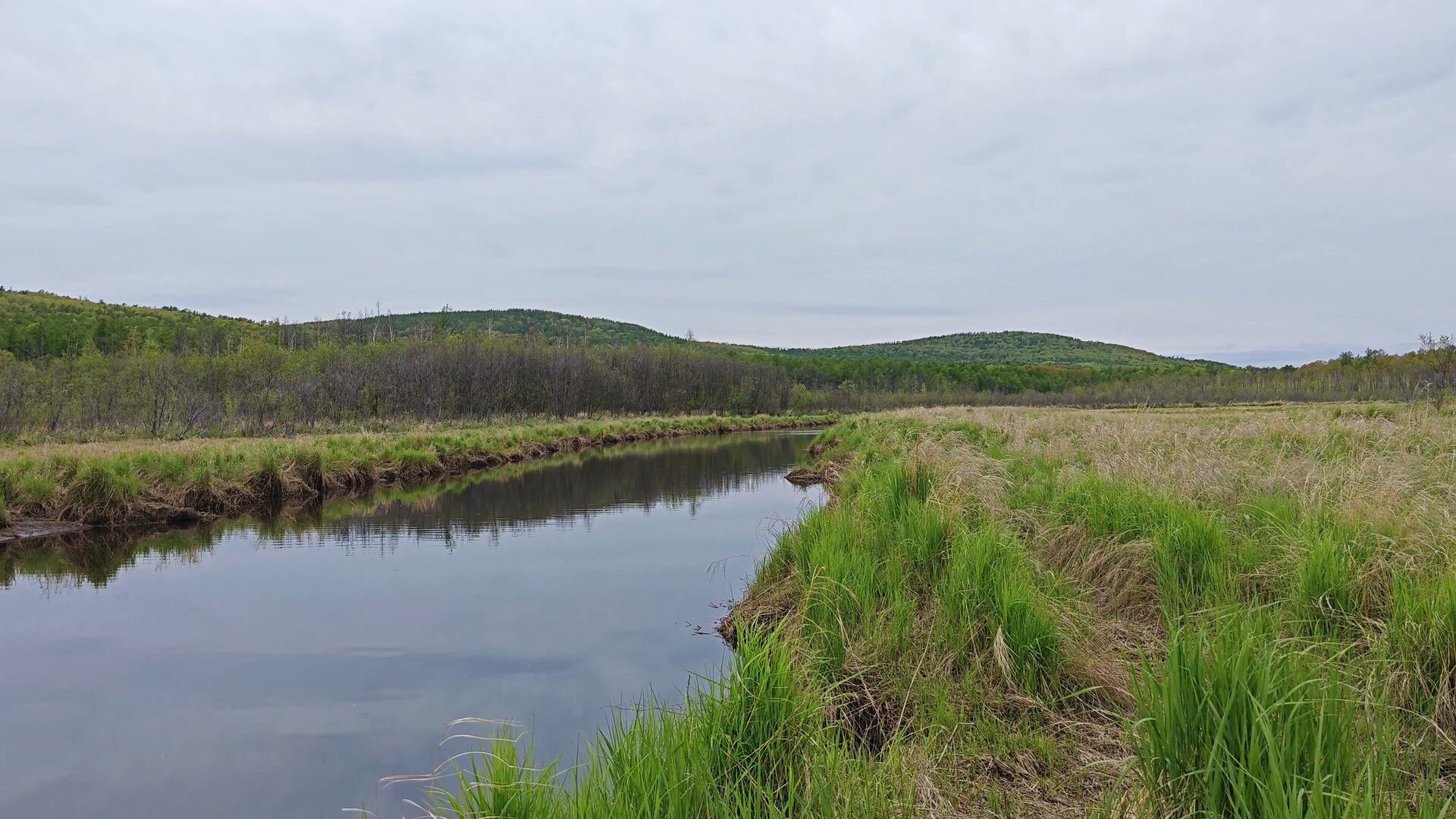 20 минут езды на машине по трассе Николаевск – Маго до моста через желанную речку, еще 15 минут неспешной ходьбы по лесной дорожке – и я на месте. Типичная небольшая горно-таёжная речка в своих низовьях, шириной 10 -15 метров, с тихим течением и торфянными берегами, поросших травой и кустарником. В разгар лето носятся в этой части реки стаи откормленных чебаков, хватающих жадно мелкие колебалки, рыскает небольшая щучка, попадается плоскоголовый жерех, идёт на нерест кета и горбуша. А в верховьях пережидают летний зной шустрые хариусы, прожорливые «пеструшки» (значит, сима проскакивает, но лично сам ни разу не видел этого лосося), яркие мальмушки да вальяжные ленки. Вот на последних то я и собрался в этот день поохотиться со спиннингом. По моим наблюдениям, зайдя в речку из Амура после зимовки, эти пестрые хищники какое то время, до прогрева воды, тусуются в низовьях, и только потом поднимаются выше, когда начинает припекать.