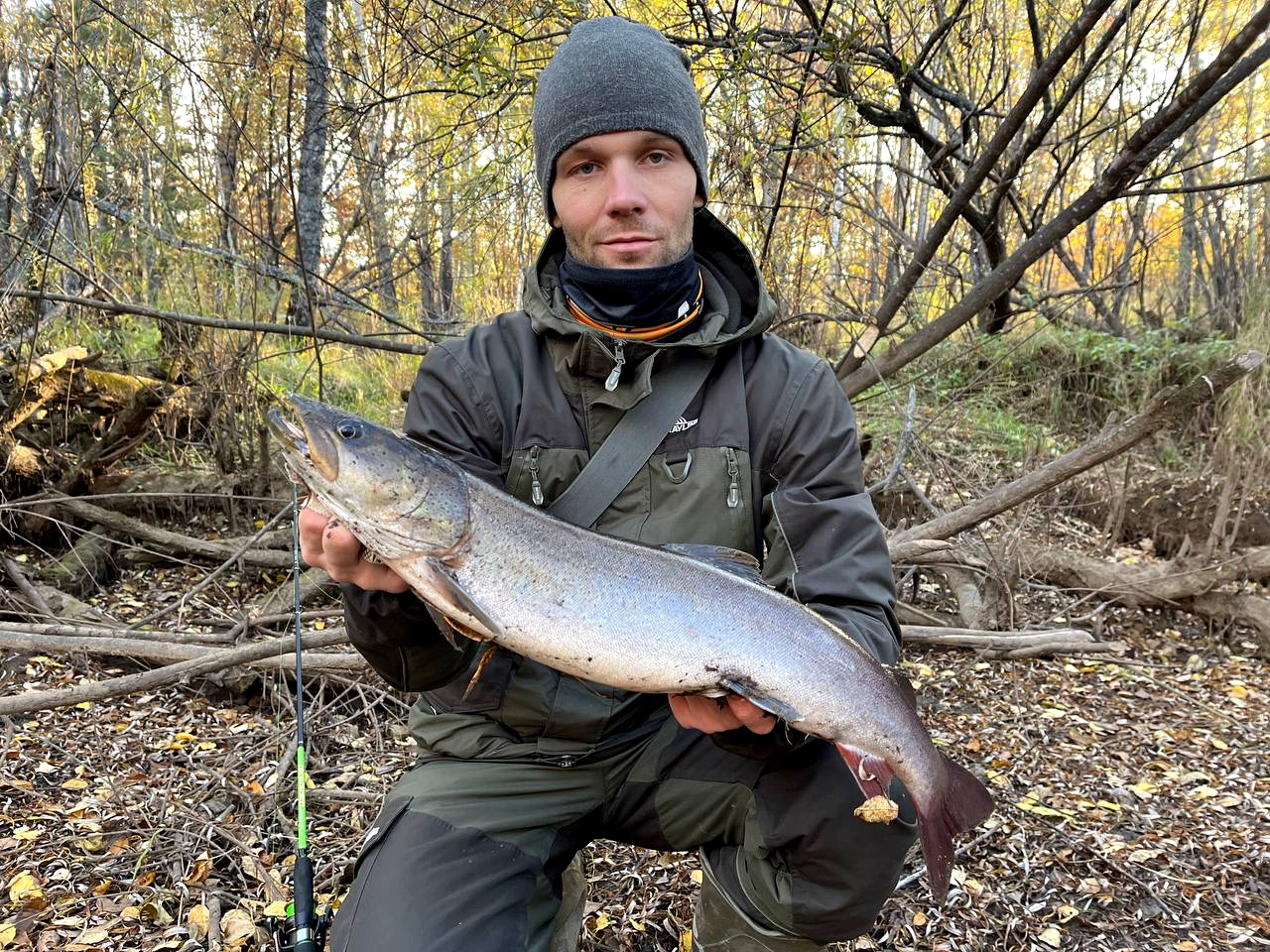 Выяснять не стали, рано или поздно для этих мест по хариусу, смотали удочки, и полностью переключились на спиннинговую рыбалку.. Валера надел свою счастливую шапку и результат не заставил себя ждать.. :E048: Чуть ранее ему же влетел бонусный «леопард»..