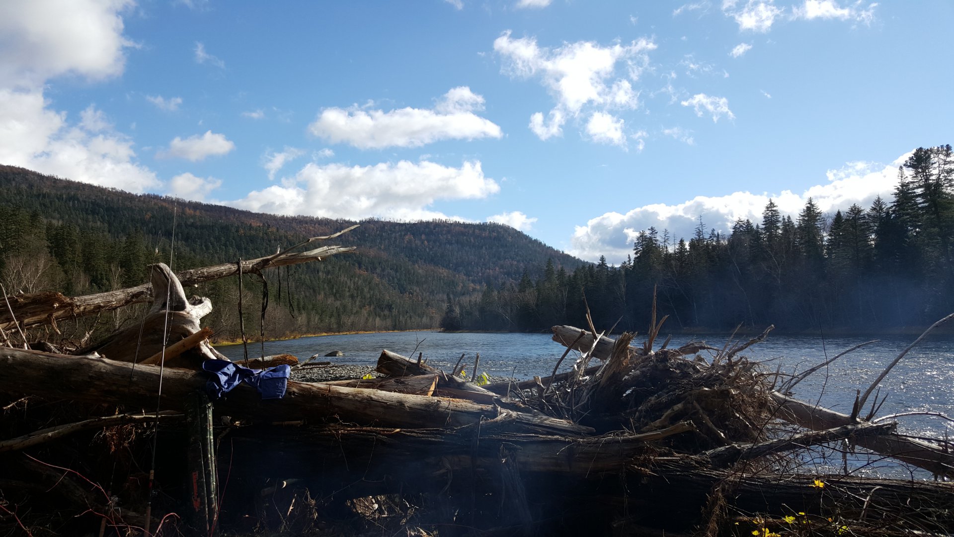С погодой повезло. Ночью был дождь, а днем ясно и тепло, только в воскресенье под конец дня снег повалил столбом, народ разбежался. улов хороший, рыбы много, хариус клювал отлично. Ленок крупненький. Встретились с медведем который переплывал реку, были в пяти метрах от него, красавец.