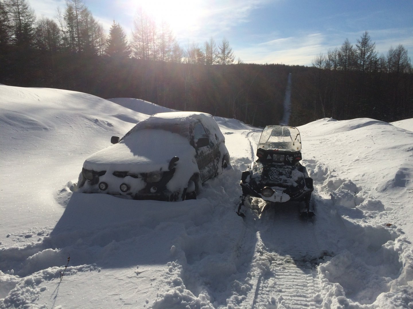 Чем больше эксплуатирую Ямаху тем больше убеждаюсь, что это вещь. На выходные ездили на рыбалку после крайнего снегопада от буранника осталось одно воспоминание, пришлось себе бить дорогу. Буран не поехал, Ямаха неохотно, но пошла.