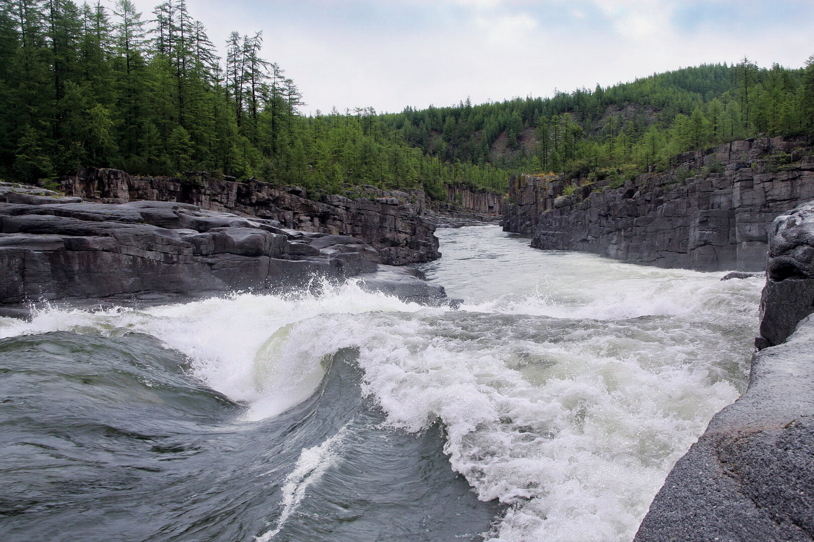 Если с другой стороны лесом, то река не зажата. При наводнении река выходит из берегов и течет по лесу. А вот в каньоне страшно. Меня наводнение застало в каньоне на реке Мая. За час вода поднялась по высоте более, чем на три метра. Мы убегали от воды, чтобы спастись. Скорость течения реки, несущей бревна и целые заломы была километров 40. Это был ад.
