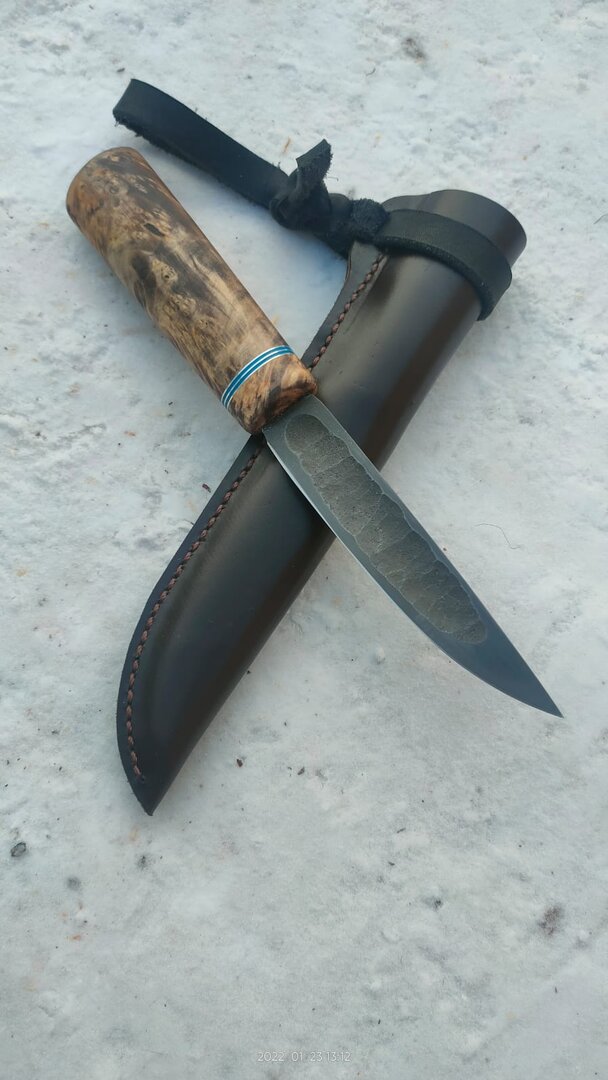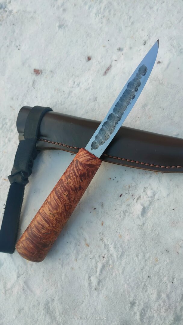 Заходил на выходных в магазин о котором ранее сообщалась, имеются там значит два якута, один большой другой среднтй, большой мне не понравился, а вот малый вполне себе интересный. Все как у настоящих якутов, дол кованый, сам клинок тоже с элементами ковки, ножны бычий хвост с каким то орнаментом. На вид довольно добротный.