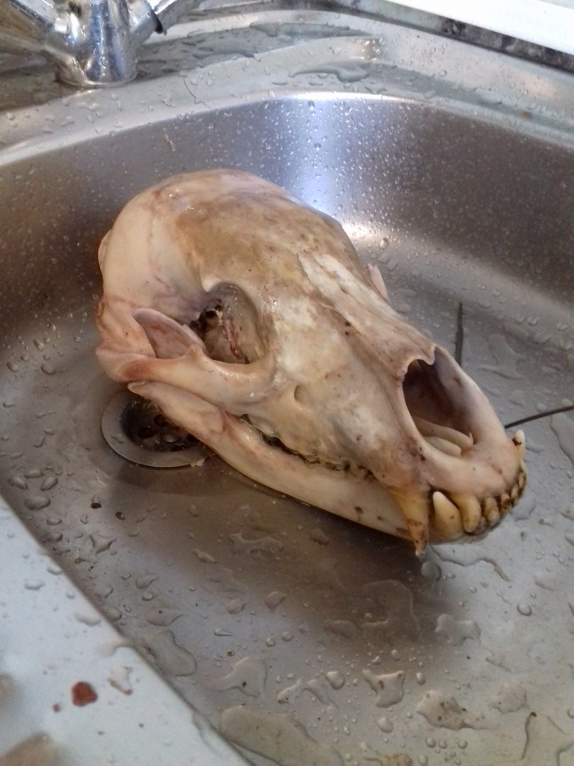 после кипячения снял все мясо Керхером вышли мозг... и на два дня в муровейник.Я вычищал с затылка и через нос, из нутри все тонкие перегородки вытащил и промыл хорошенько стенки, перекись и фэйри не применял, обошёлся одним отбеливателем " Белизна", бутылка на ведро воды. После него ни зубы не вываливались, ни клыки не трескались, главное сильно не пересушить, не помню точно, но по моему на третий день сушки я его лаком с болончика покрыл и с нутри и с наружи.