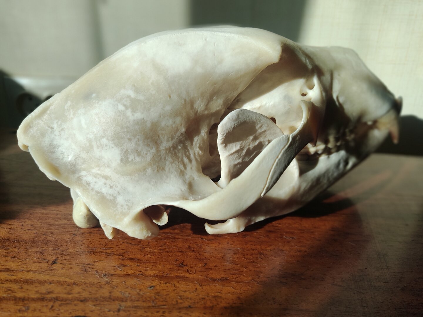 Не меньше и не больше 8 лет. В 10 лет уже на верхней челюсти совсем нет трещин и гребень на затылке (киль) явно поднимается от черепа где-то на 2-3 см. на нижней челюсти трещина тоже зарастает и уже при варке не распадается. В 15 лет гребень уже 4-5 см. Трещин совсем нет, на черепе появляются ямочки (мелкие выбоины), нижнюю челюсть даже при большом усилии уже не разделить, клыки обычно сильно сточены иногда обломаны, зубы тоже сточены. В 20 лет это уже не медвежий череп, а скорее теропод., скулы расширяются, глазные яблоки увеличиваются. Хотя нужно отметить, что длина клыков не сильно отличается что у пестуна, что у пенсионера, только у старого клыки полностью костяные, без пустот. Наверное им , как и нам зубы даются один раз и на всю жизнь (я имею ввиду коренные).