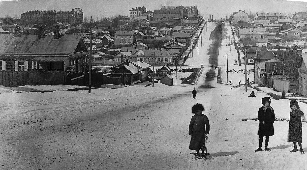 На фото ул. Дзержинского, имхо, дети катаются на санках, на переднем плане у пацана на санках похоже перекладина для ног, как мы делали на самокатах. Ниже по центру дороги, ребенок тянет за собой сани, видимо съехал недавно. Справа внизу ребёнок сидит на санях, тоже смотрит на фотографа. Классное фото!Зима 1902-1903 годов. Видно магазин Чурина за триумфальной аркой на Соборной площади.