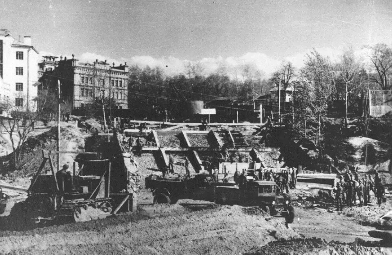 В качестве рабочих, как обычно, солдаты. Время такое было. Вся территория стадиона на солдатских руках построена. Спасибо им, за это самое красивое место города. Я на полном серьёзе.