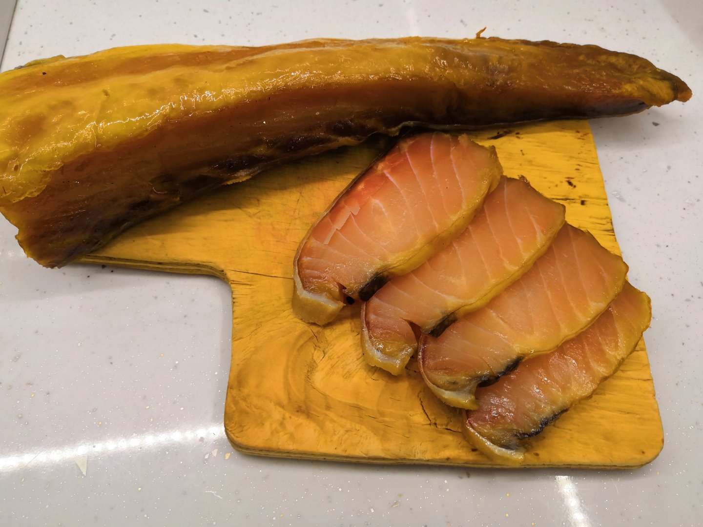 Рецепт : солил сухим посолом 6 часов, сполоснул, вялил 3 дня, коптил 14 часов. Малосольный.
