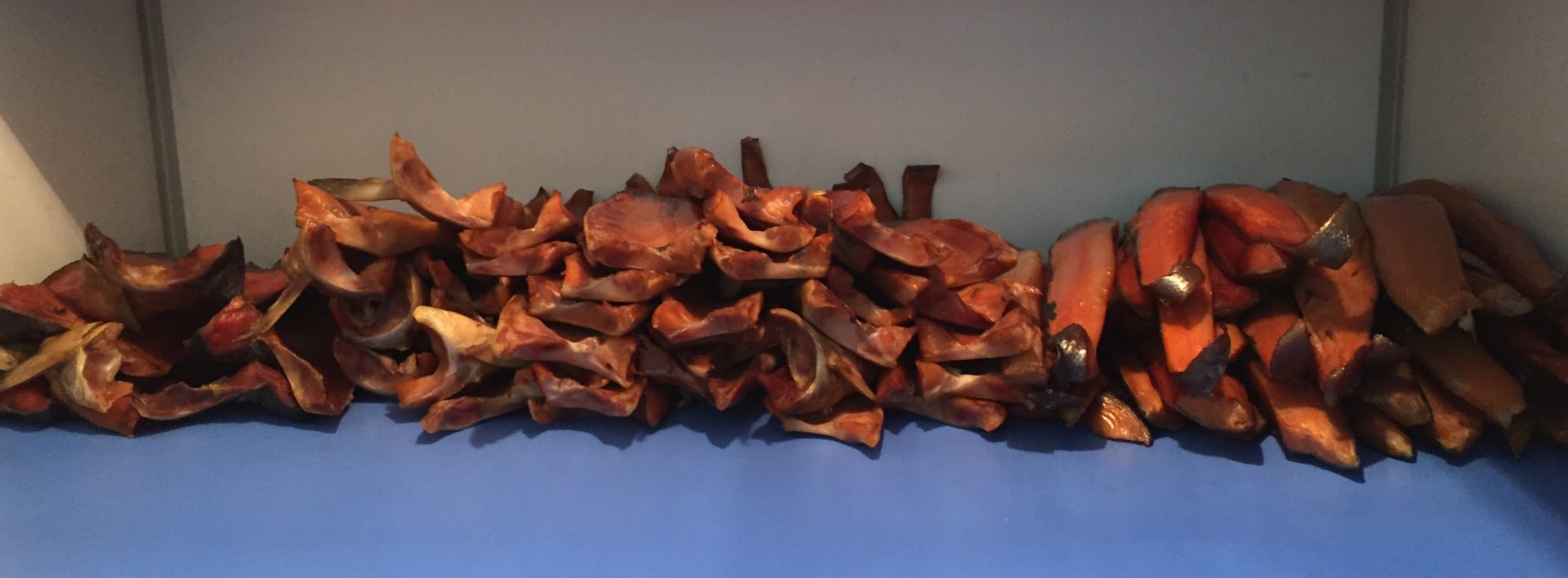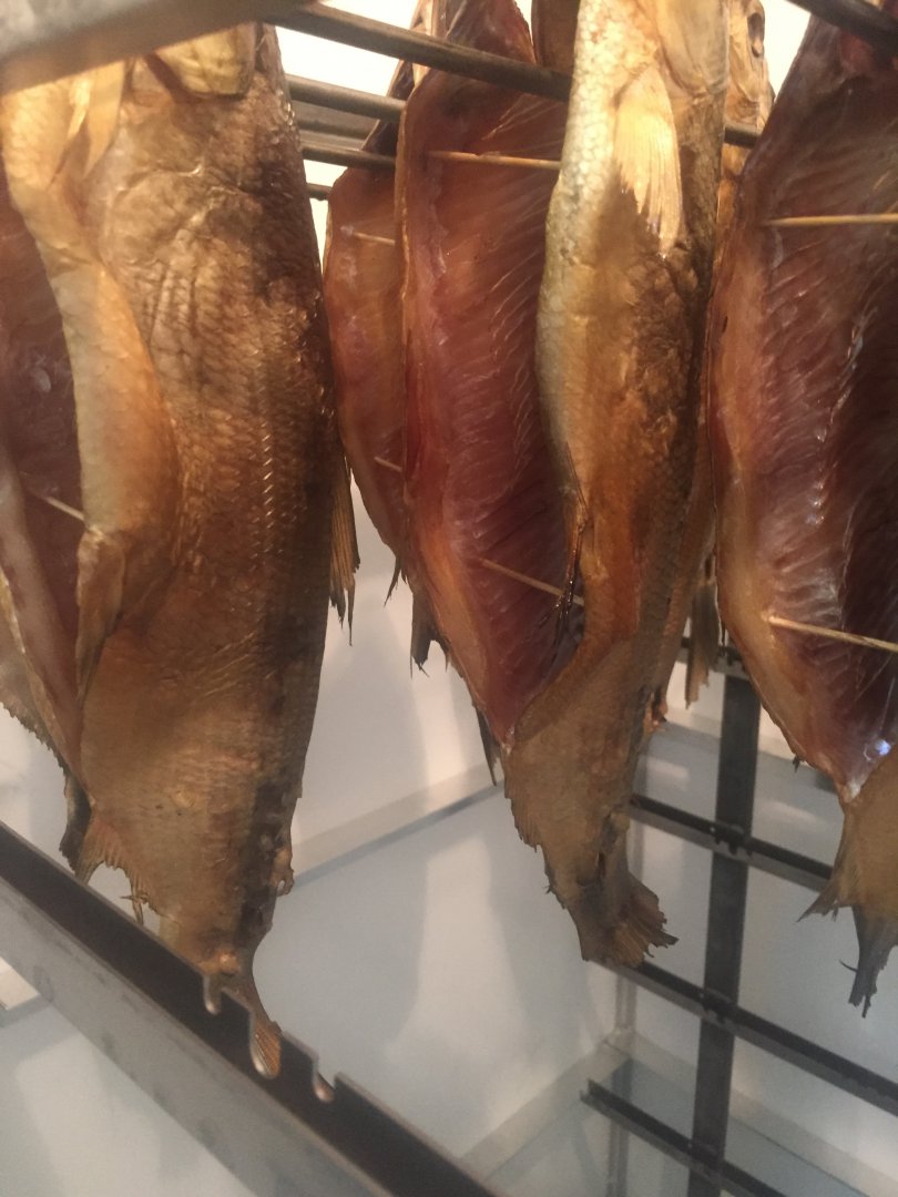 3. Перед копчением необходимо рыбу подвялить. Довольно требовательный процесс. После просушки внутренняя часть рыбы должна иметь плотную корочку, а мясо должно быть в меру мягким. Распорки само - сабой, летом марля обязательна( от мух). Марля не должна соприкасаться с рыбой. Если соприкасается, то мухи оставят свои яйца(я обжигался на этом). Из тонкой стальной проволоки делал абажур вокруг рыбины и обтягивал его марлей. Обдувка вентиляторами до степени готовности каждой рыбины. Так делал на балконе и в гараже. Улучшил процесс подготовки рыбы к копчению в подвале. Обдувал рыбу вентиляторами через тэны, едва тёплым воздухом.