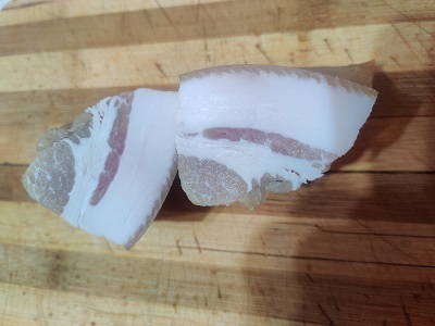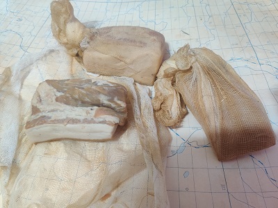 В старые добрые времена отец делал свиной окорок и коптил,обматывая марлей. После копчения окорок висел в погребе и он ходил и отрезал по куску.