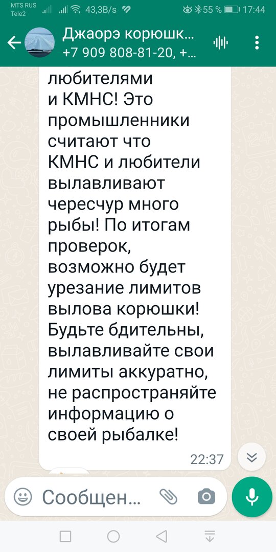 В группе вотсап "Джаоре корюшка", весь месяц выкладывали фото уловов корюшки - мешками и десятками кг, при норме вылова 150 штук. А последнюю неделю пошли такие сообщения: " Подъехали погранцы, пересчитали корюшку, выписали штраф 60 000 рублей", " Погранцы - суки нарисовали 50 000 штрафа", "Соседям из Владивостока пересчитали корюшку в багажнике и выписали 50 000".