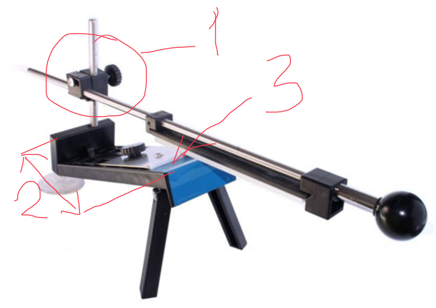 Но смысл из фото, думаю понятен. Самое ценное - шарнир 1, который позволяет двигаться кромке заточки по закруглению ножа. Расстояние 2 - это радиус окружности, в кооторую вписывается сектор ножа. А к синей площадке 3 надо закрепить сам нож. Можно болтиками, можно ещё как то, просверлив 2 дырдочки по штатным отверстиям ножа. Потом путём выставления опять же шарнира 1 вверх-вниз, надо поймать угол заточки и усё.