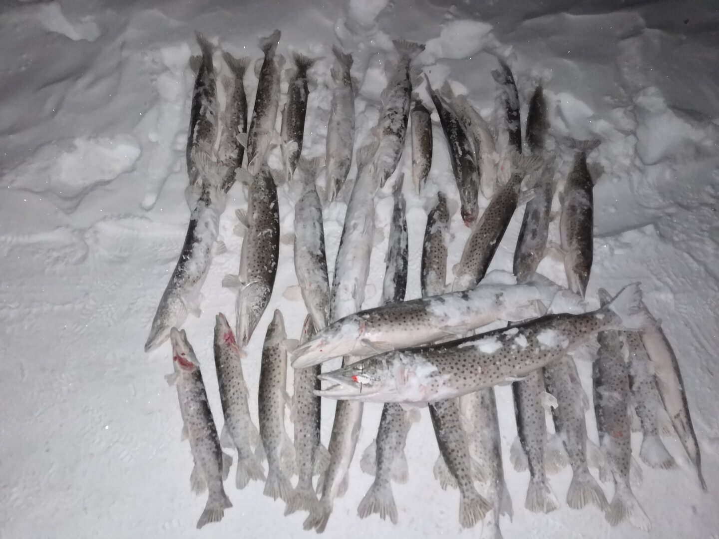 Начало рыбалки +/- 9 часов - так себе, часов с 11 веселее, в районе 13 или около того поднялся ветерок, со стороны Хабаровска налетела тучка, посыпал снежок и как будто кто то открыл калитку загона со щуками, поклевка после каждого третьего-пятого взмаха, причем поклевки такие что практически выбивает махалку из рук, итог на фото.