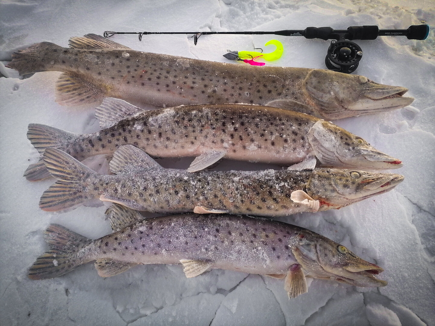По итогу рыбалки - 10шт на двоих и несколько сходов. Откровенно мелкой "стеклянной" щуки не было, все экземпляры хорошие. У Валеры работали ратлины и крабы, я же весь день рыбачил на джиг, так скажем нарабатывал опыт и статистику по работе данной приманки в зимних условиях.